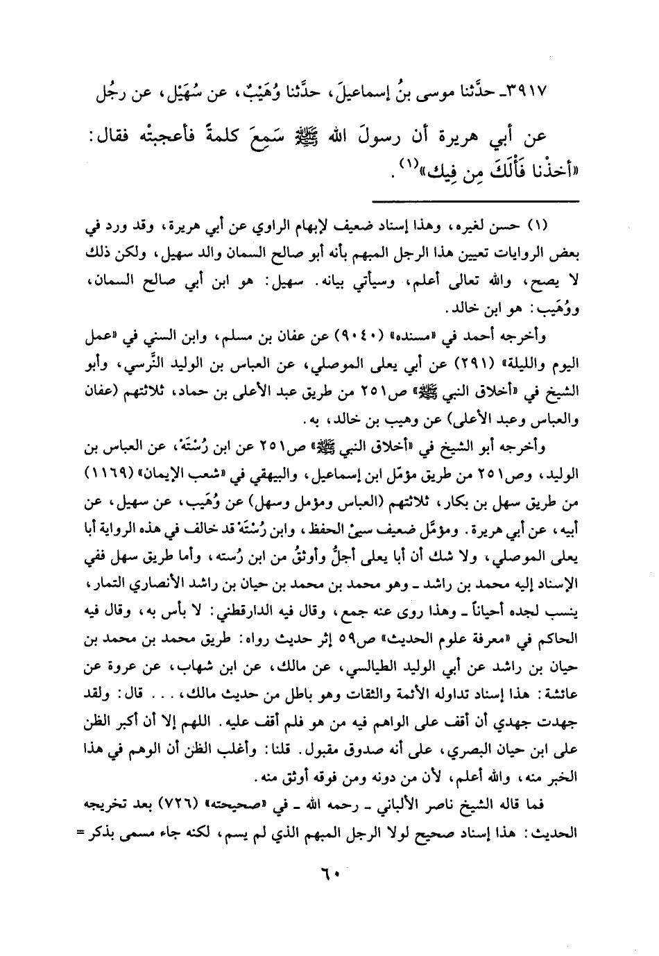 وأخرجه أبو الشيخ في "أخلاق النبي - صلَّى الله عليه وسلم -" ص ٢٥١ عن ابن رُسْتَهْ، عن العباس بن الوليد، وص ٢٥١ من طريق مؤمّل ابن إسماعيل، والبيهقي في "شعب الإيمان" (١١٦٩) من طريق سهل بن بكار، ثلاثتهم (العباس ومزمل وسهل) عن وُهَيب، عن سهيل، عن أبيه، عن أبي هريرة. ومؤمَّل ضعيف سيئ الحفظ، وابن رُسْتَه قد خالف في هذه الرواية أبا يعلى الموصلي، ولا شك أن أبا يعلى أجلُّ وأوثقُ من ابن رُسته، وأما طريق سهل ففي الإسناد إليه محمد بن راشد - وهو محمد بن محمد بن حيان بن راشد الأنصاري التمار، يُنسب لجده أحياناً- وهذا روى عنه جمع، وقال فيه الدارقطني: لا بأس به، وقال فيه الحاكم في "معرفة علوم الحديث" ص ٥٩ إثر حديث رواه: طريق محمد بن محمد بن حيان بن راشد عن أبي الوليد الطيالسي، عن مالك، عن ابن شهاب، عن عروة عن عائشة: هذا إسناد تداوله الأئمة والثقات وهو باطل من حديث مالك" ... قال: ولقد جهدت جهدي أن أقف على الواهم فيه من هو فلم أقف عليه. اللهم إلا أن أكبر الظن على ابن حيان البصري، على أنه صدوق مقبول. قلنا: وأغلب الظن أن الوهم في هذا الخبر منه، والله أعلم، لأن من دونه ومن فوقه أوثق منه.