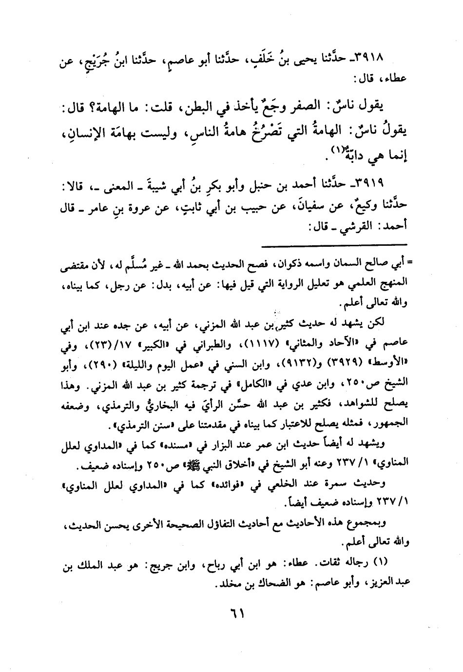 يقول ناسٌ: الصفر وجَعٌ يأخذ في البطن، قلت: ما الهامة؟ قال: يقولُ ناسٌ: الهامةُ التي تَصْرُخُ هامةُ الناسِ، وليست بهامَة الإنسانِ، إنما هي دابّةٌ (¬١).