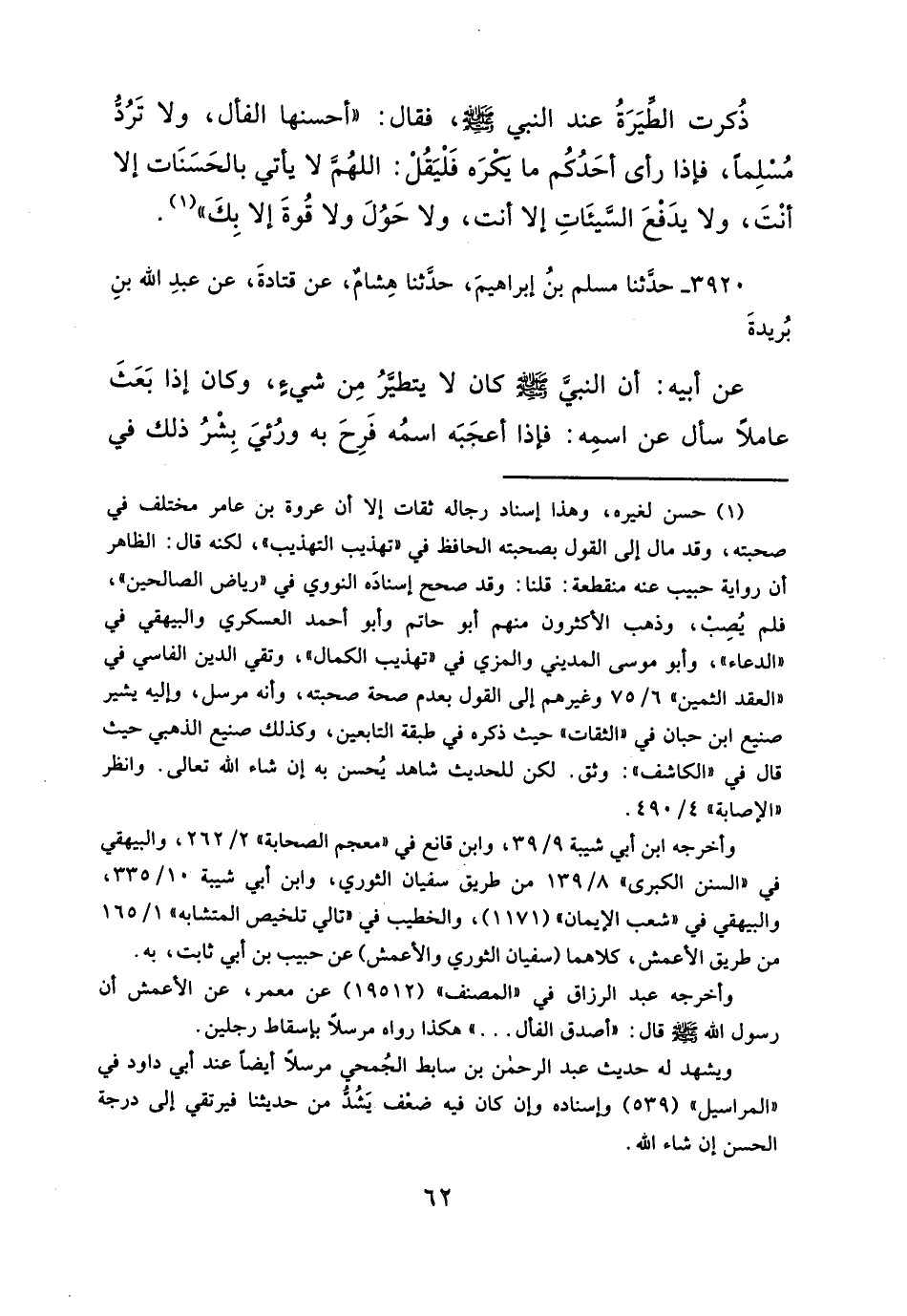 ذُكرت الطِّيَرَةُ عند النبي - صلَّى الله عليه وسلم -، فقال: "أحسنها الفأل، ولا تَرُدُّ مُسْلِماً، فإذا رأى أحَدُكُم ما يَكْرَه فَلْيَقُلْ: اللهُمَّ لا يأتي بالحَسَنَات إلا أنْتَ، ولا يدَفْعَ السَّيئَاتِ إلا أنت، ولا حَوُلَ ولا قُوةَ إلا بِكَ" (¬١).