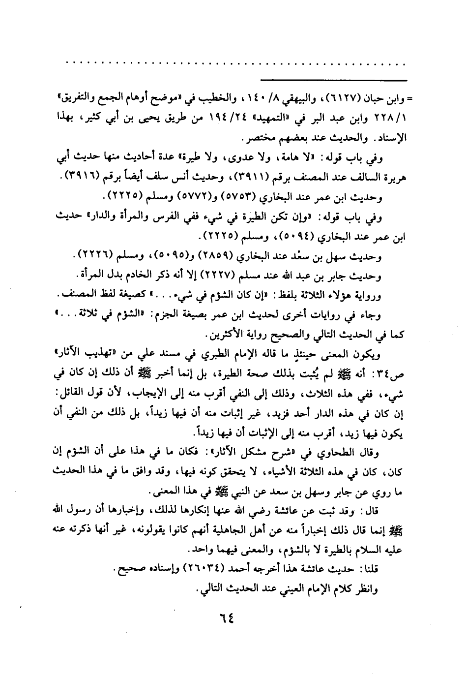 قال: وقد ثبت عن عائشة رضي الله عنها إنكارها لذلك، وإخبارها أن رسول الله - صلَّى الله عليه وسلم - إنما قال ذلك إخباراً منه عن أهل الجاهلية أنهم كانوا يقولونه، غير أنها ذكرته عنه عليه السلام بالطيرة لا بالشؤم، والمعنى فيهما واحد.