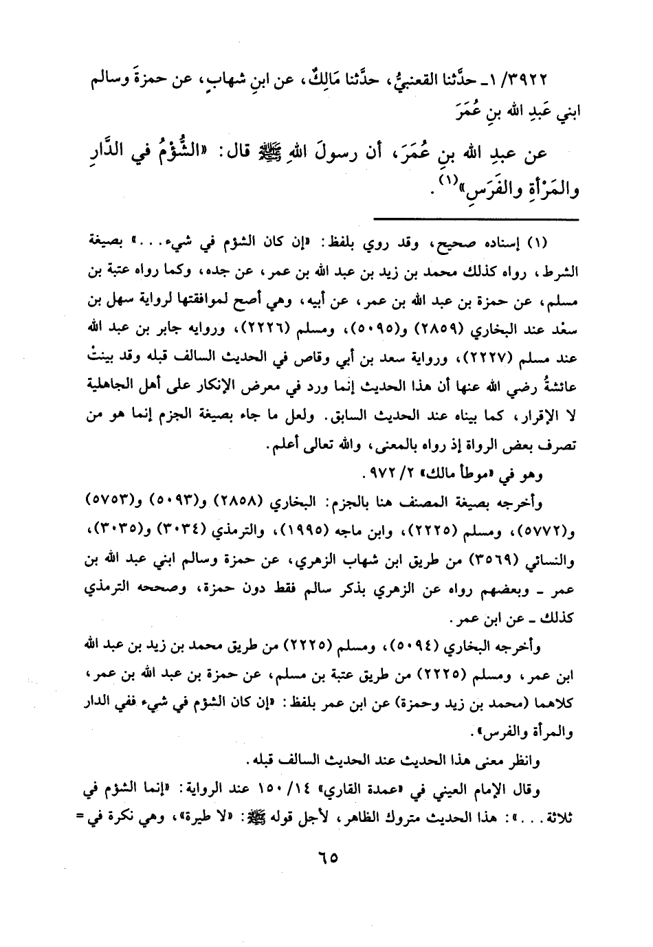 عن عبدِ الله بنِ عُمَرَ، أن رسولَ الله - صلَّى الله عليه وسلم - ِ قال: "الشُوْمُ في الدَّارِ والمَرْأةِ والفَرَسِ" (¬١).