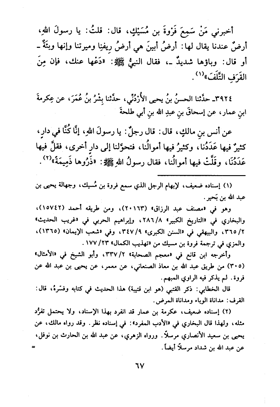 أخبرني مَنْ سَمعَ فَرْوةَ بن مُسَيْكٍ، قال: قلتُ: يا رسولَ الله - صلَّى الله عليه وسلم - ِ، أرض عندنا يقال لها: أرضُ أبينَ هي أرضُ رِيفنِا وميرتنا وإنها وبئَةٌ -أو قال: وباؤها شديدٌ -، فقال النبي - صلَّى الله عليه وسلم -:، دَعْها عنك، فإن مِنَ القَرَفِ التَّلَفَ" (¬١).