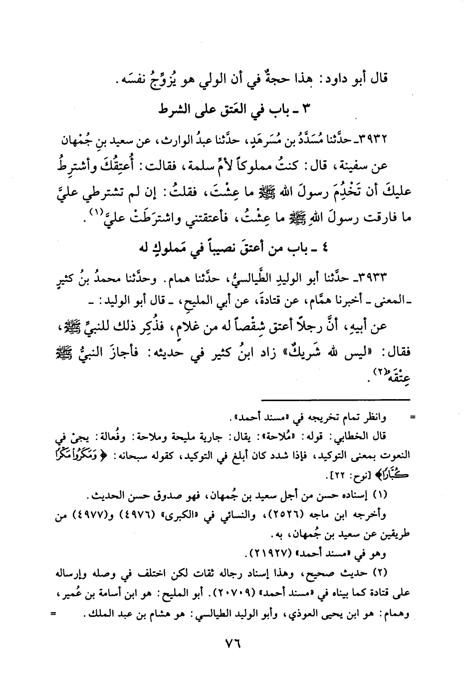 عن سفينة، قال: كنت مملوكاً لأمِّ سلمة، فقالت: أعتِقُكَ وأشترِطُ عليكَ أن تَخْدِمَ رسولَ الله - صلَّى الله عليه وسلم - ما عِشْتَ، فقلتُ: إن لم تشترطي عليَّ ما فارقت رسولَ الله - صلَّى الله عليه وسلم - ما عِشْتُ، فاعتقتني واشترَطَتْ عليَّ (¬١).