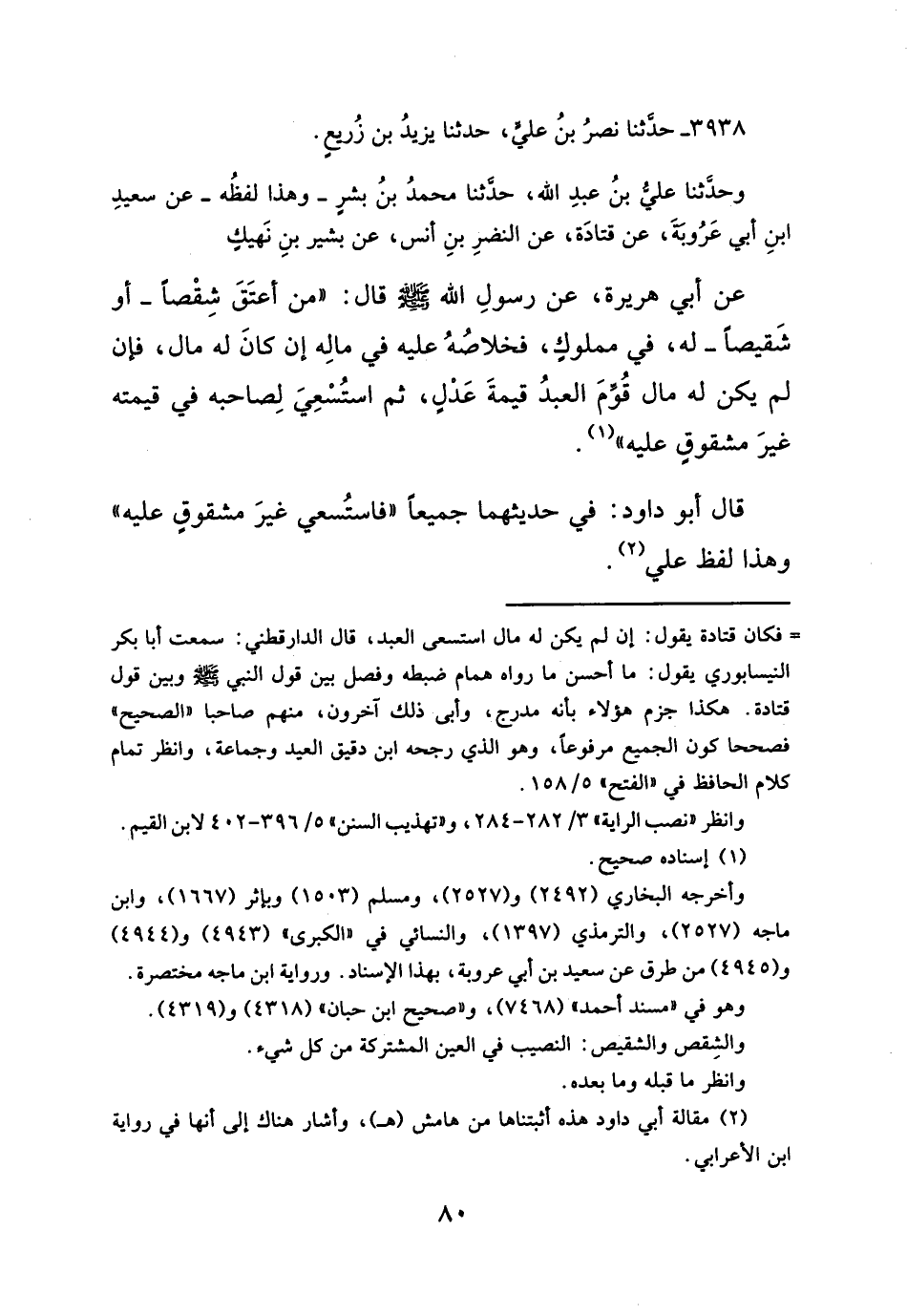 قال أبو داود: في حديثهما جميعاً "فاستُسعي غيرَ مشقوقٍ عليه" وهذا لفظ علي (¬٢).