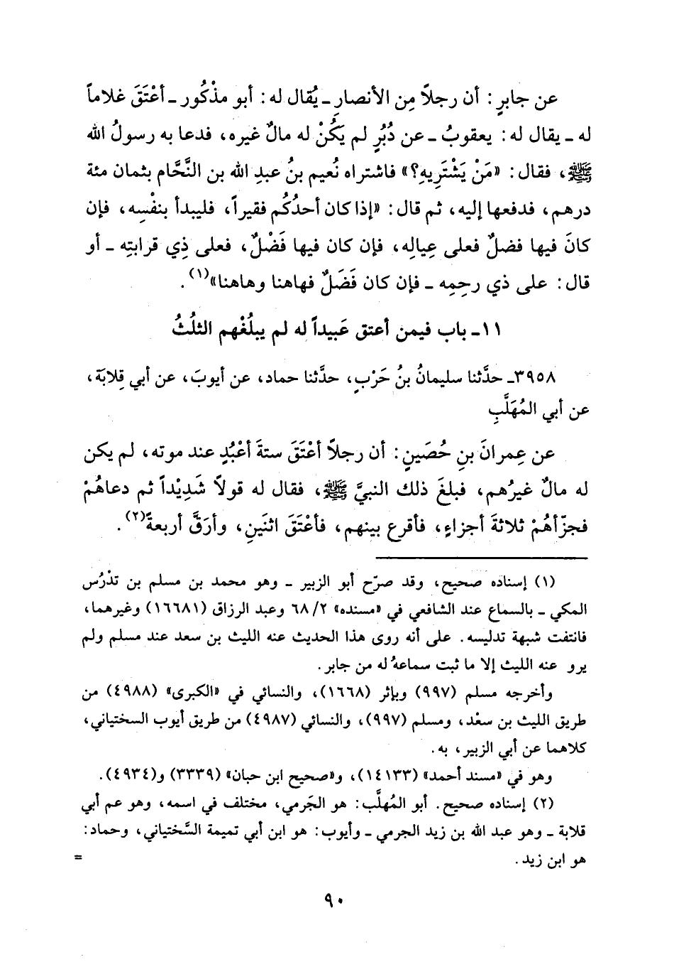 عن عِمرانَ بنِ حُصَينِ: أن رجلاً أعْتَقَ ستةَ أعْبُدٍ عند موته، لم يكن له مالٌ غيرُهم، فبلغَ ذلك النبي - صلَّى الله عليه وسلم -، فقال له قولاً شَدِيْداَ ثم دعاهُمْ فجزّأهُمْ ثلاثةَ أجزاءٍ، فأقرع بينهم، فأعْتَقَ اثنَينِ، وأرَقَّ أربعةً (¬٢).