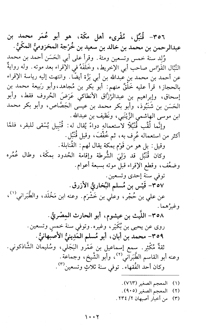 356 - قنبل، مُقْرِئ أهل مكّة، هو أبو عُمَر محمد بن عَبْد الرَّحْمَن بن محمد بن خالد بن سعيد بن خرجة المخزوميّ المكّيّ. [الوفاة: 291 - 300 ه]