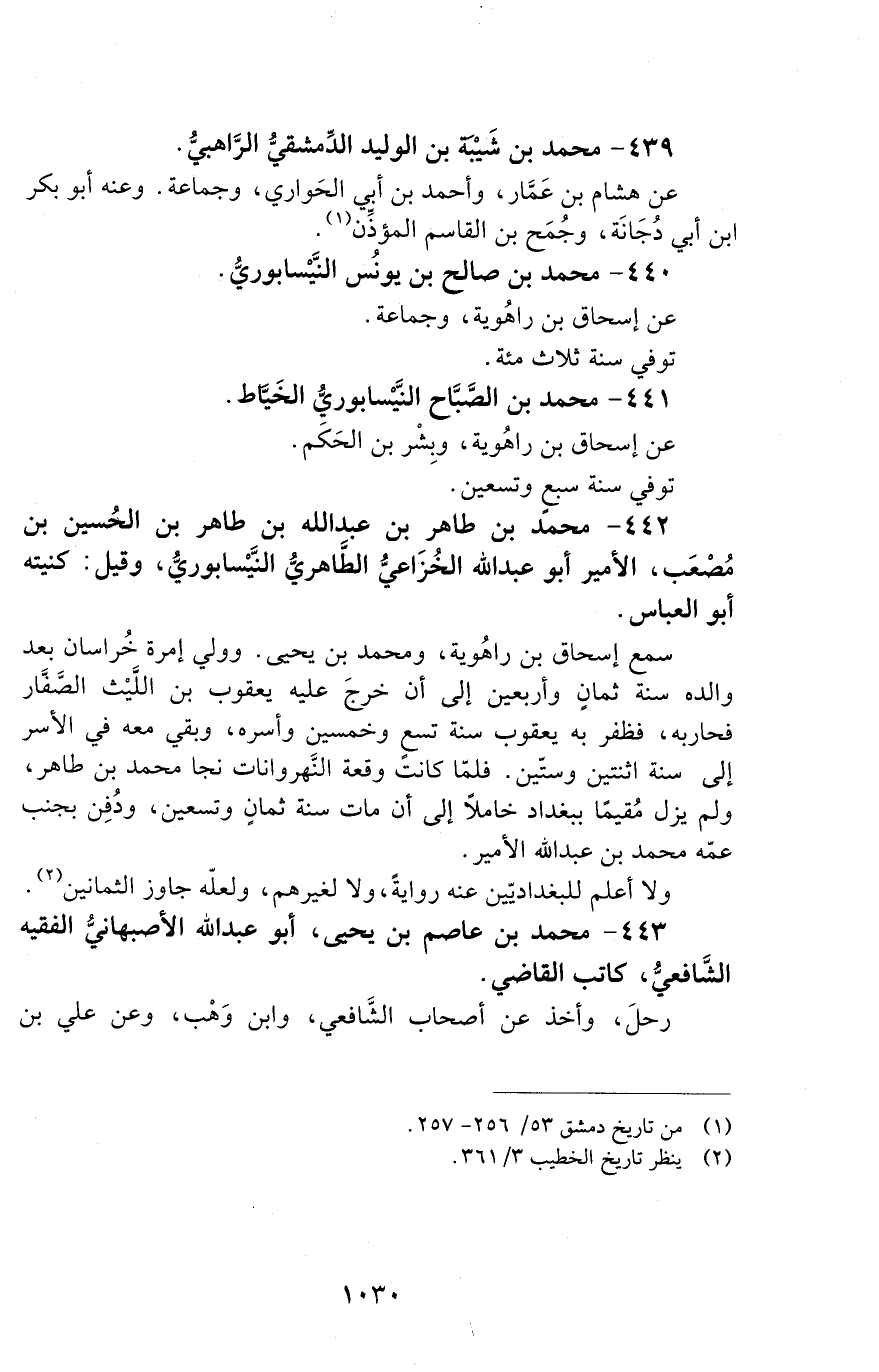 442 - محمد بن طاهر بْن عَبْد اللَّه بْن طاهر بْن الْحُسَيْن بن مُصْعَب. الأمير أبو عبد الله الخُزَاعيّ الطّاهريّ النَّيْسَابوريُّ، وقيل: كنيته أبو العبّاس. [الوفاة: 291 - 300 ه]