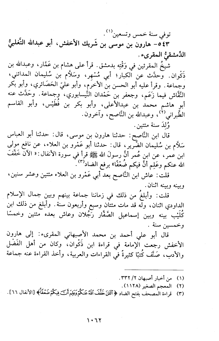 543 - هارون بن موسى بن شريك الأخفش أبو عبد الله التَّغلبيُّ الدِّمشقيُّ المقرئ. [الوفاة: 291 - 300 ه]