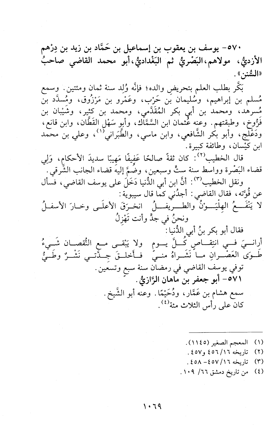 570 - يوسف بْن يعقوب بْن إسماعيل بْن حمّاد بن زيد بن درهم الأزدي مولاهم، الْبَصْرِيُّ ثم البَغْداديُّ. أبو محمد القاضي [الوفاة: 291 - 300 ه]