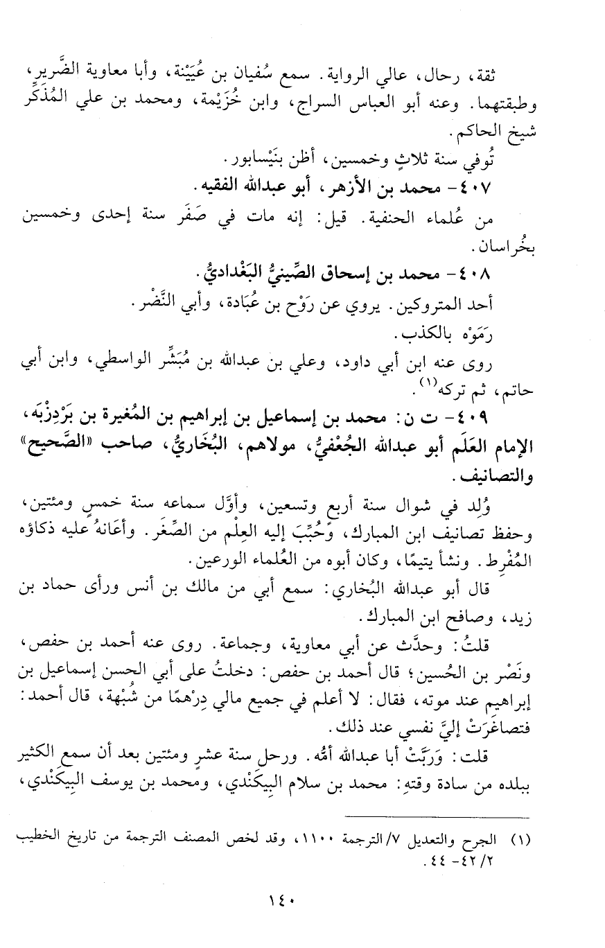 409 - ت ن: محمد بْن إِسْمَاعِيل بْن إِبْرَاهِيم بْن المغيرة بْن بردزبه، الْإمَام العَلَم أبو عبد الله الجعفي، مولَاهُمُ، الْبُخَارِيّ، [الوفاة: 251 - 260 ه]