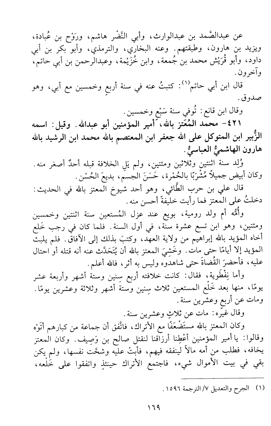 421 - محمد المعتزّ بالله، أمير المؤمنين أبو عبد الله. وقيل: اسمه الزبير ابن المتوكّلُ عَلَى الله جعفر ابن المعتصم بالله محمد ابن الرّشيد بالله هارون الهاشميّ العباسيّ. [الوفاة: 251 - 260 ه]