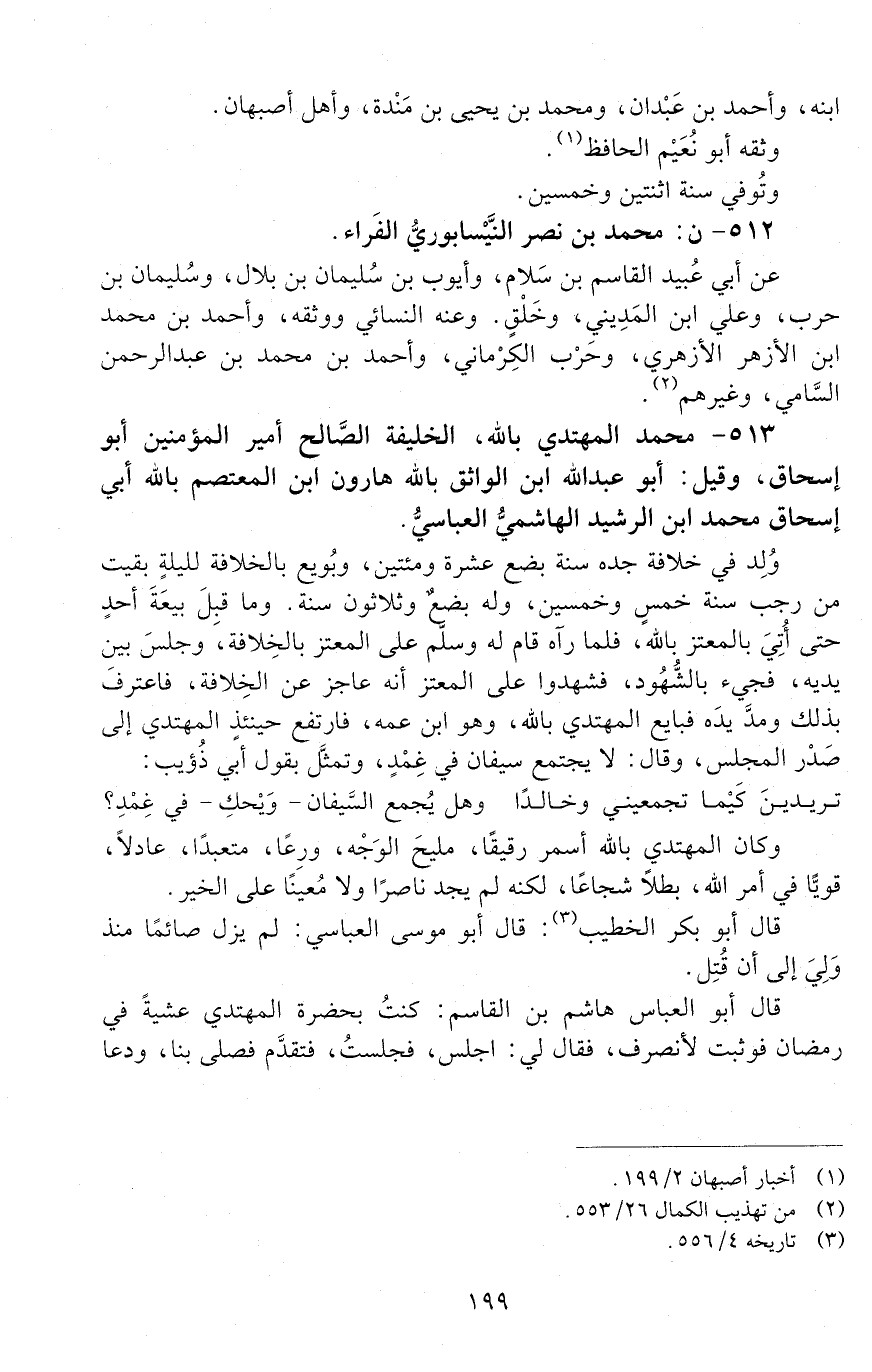 513 - محمد المهتدي بالله، الخليفة الصّالح أمير المؤمنين أَبُو إِسْحَاق، وقيل: أبو عبد الله ابن الواثق بالله هارون ابن المعتصم بالله أبي إسحاق محمد ابن الرشيد الهاشميّ العبّاسيّ. [الوفاة: 251 - 260 ه]