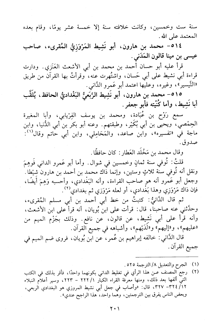قلت: تُوُفّي سنة ثمانٍ وخمسين فِي شوّال. وأمّا أَبُو عَمْرو الدّانيّ فَوِهَم، ونقل أنّه تُوُفّي سنة ثلَاثٍ وستين، وإنّما ذاك محمد بْن أَحْمَد بْن هارون شِيطا. وجعل أَبُو عَمْرو أَنَّهُ هُوَ صاحب القراءة، وأنّه البغدادي. وأحسبه وَهِمَ أيضًا، فإن ذاك مَرْوَزِيّ وهذا بغدادي، أو لعلّه مَرْوَزِيّ ثمّ بغداديّ.