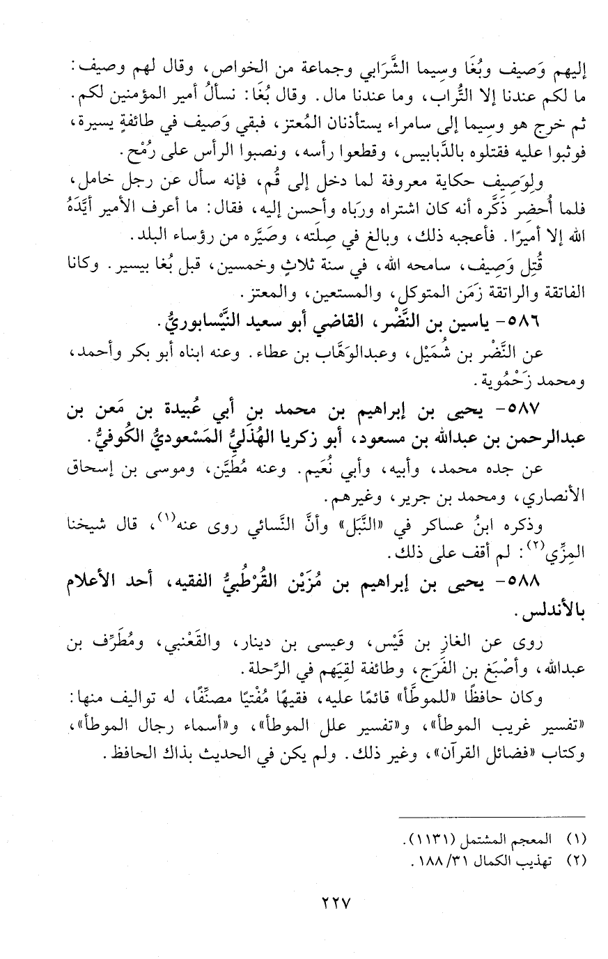 587 - يحيى بْن إِبْرَاهِيم بْن محمد بْن أَبِي عُبَيْدة بْنُ مَعْنُ بْنُ عَبْدِ الرَّحْمَنِ بْنِ عَبْدِ اللَّهِ بْنِ مَسْعُودٍ، أَبُو زكريّا الهُذَليّ المسعوديّ الكُوفيُّ. [الوفاة: 251 - 260 ه]