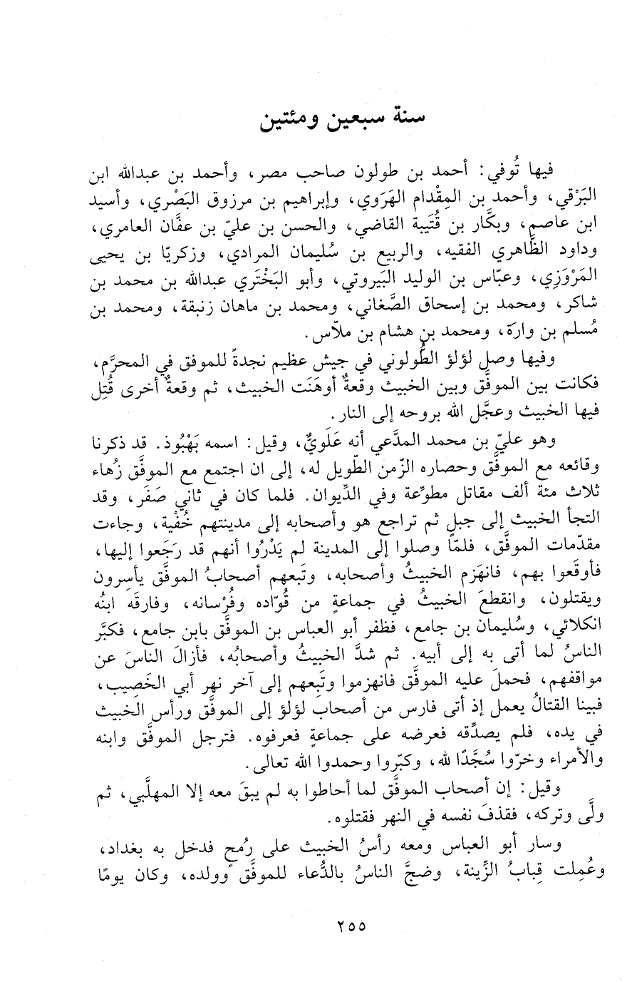 وفيها وصل لؤلؤ الطُّولوني فِي جيشٍ عظيم نجدةً للموفق فِي المحرّم، فكانت بين الموفَّق وبين الخبيث وقعةٌ أوهنت الخبيث، ثُمَّ وَقْعَةٌ أخرى قُتِلَ فيها الخبيث وعجل الله بروحه إِلَى النّار.