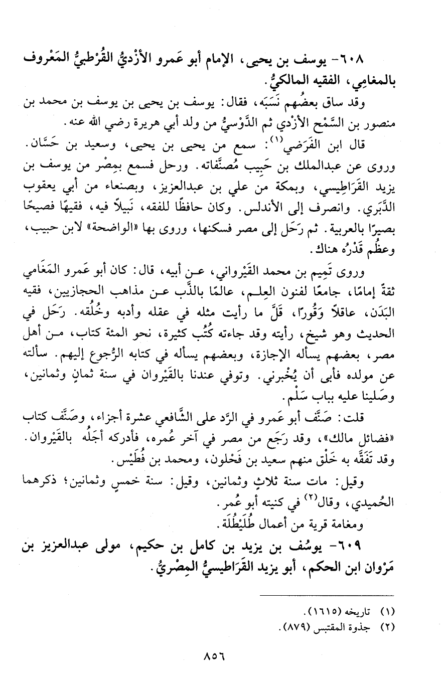 608 - يوسف بن يَحْيَى، الإمام أَبُو عَمْرو الأَزْدِيّ القُرْطُبيّ المعروف بالمغامِيّ، الفقيه المالكيّ، وقد ساق بعضهم نسبه فقال: يوسف بن يحيى بن يوسف بن محمد بن منصور بن السمح الأزدي ثُمَّ الدَّوْسيّ [الوفاة: 281 - 290 ه]