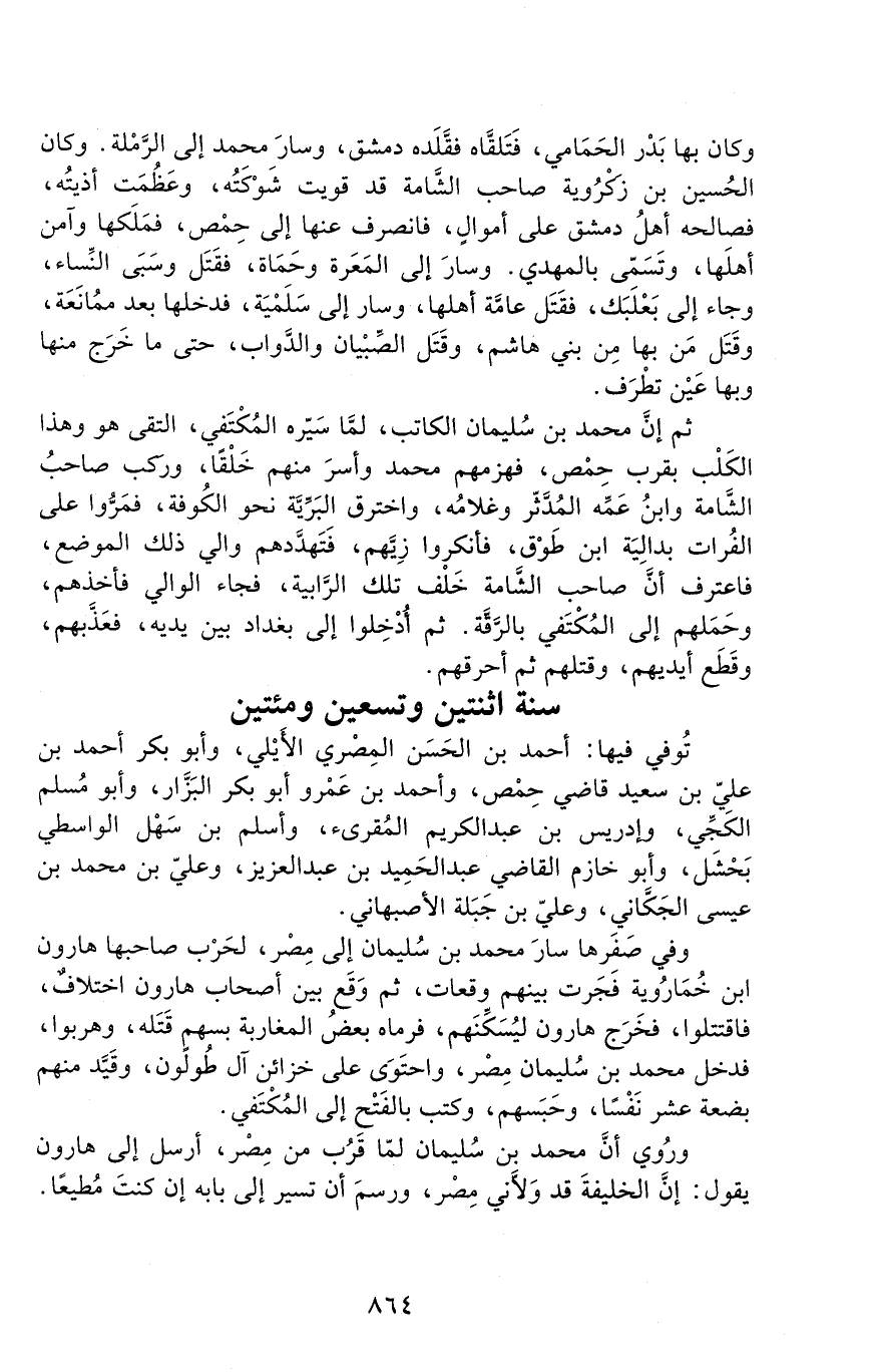 وفيها وافى طُغْجُ بنُ جُفٍّ وأخوه بدْرُ بغدادَ، ودخل بدْر الحمّاميّ، فوجّه يومئذٍ مائتي جَمّازة إلى عسكر محمد بن سليمان، لأن العباس بن الحَسَن الوزير ساء ظنه بمحمد بن سليمان، وخاف أن يغلب على مصر، وبلغه عنه كلام، فكتب إلى القُوّاد الّذين مع محمد بالقبض عليه، ففعل ذلك جماعة منهم وقيدوه.