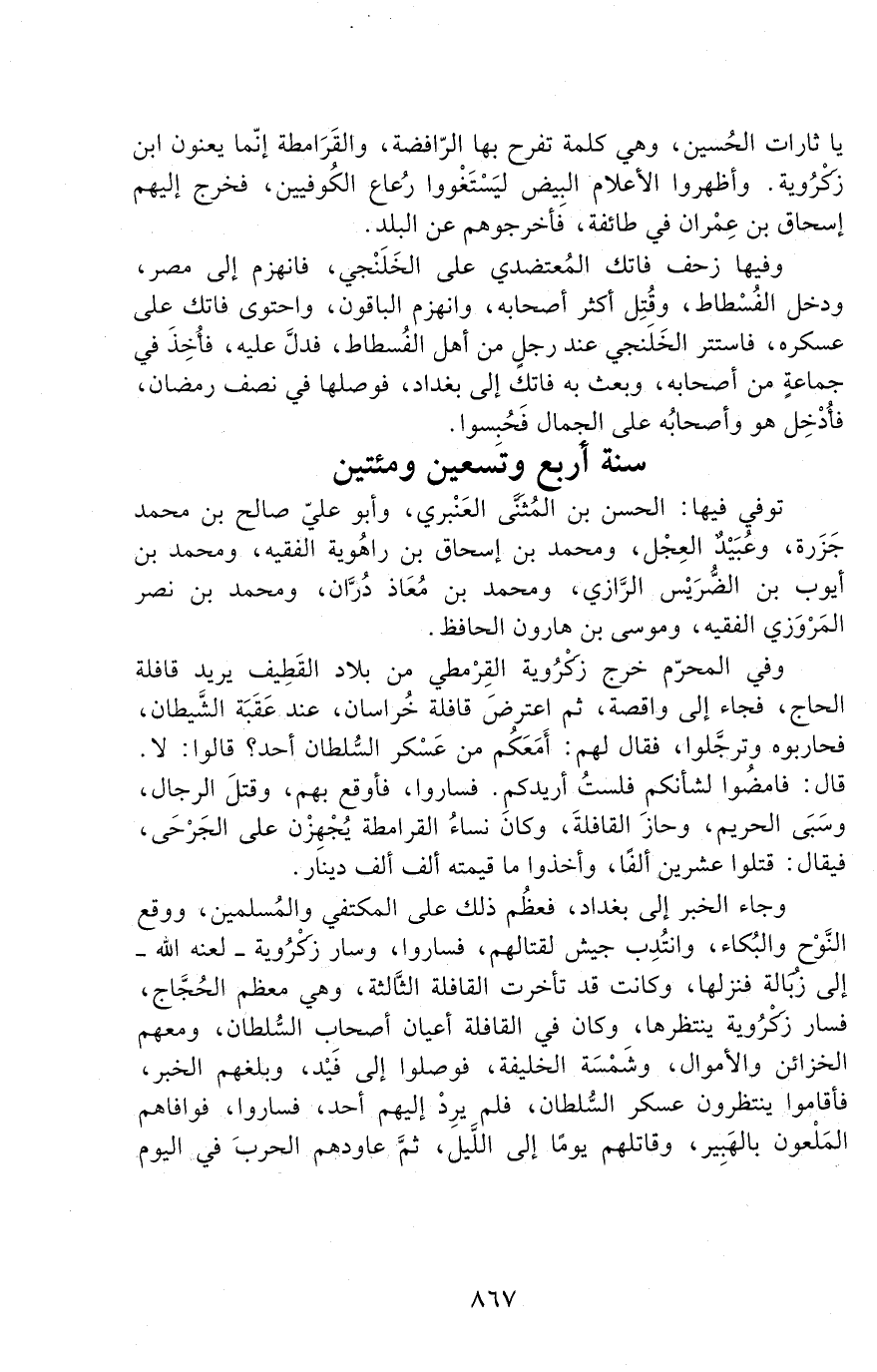 وجاء الخبر إلى بغداد، فعظُم ذلك على المكتفي والمسلمين، ووقع النَّوْح والبُكاء، وانتُدِب جيشٌ لقتالهم، فساروا، وسار زَكْرَوَيْه - لعنه الله - إلى زُبَالة فنزلها، وكانت قد تأخرّت القافلة الثّالثة، وهي معظم الحجّاج، فسار زَكْرَوَيْه ينتظرها، وكان في القافلة أعيان أصحاب السّلطان، ومعهم الخزائن والأموال، وشَمْسَة الخليفة، فوصلوا إلى فَيْد، وبلغهم الخبر، فأقاموا ينتظرون عسكر السّلطان، فلم يَرِدْ إليهم أحد، فساروا، فوافاهم الملعون بالهَبِير، وقاتلهم يومًا إلى الليل، ثم عاودهم الحرب في اليوم -[868]- الثّاني، فعِطشُوا واستسلموا، فوضع فيهم السّيف، فلم يُفْلِت منهم إلا اليسير، وأخذ الحريم والأموال.