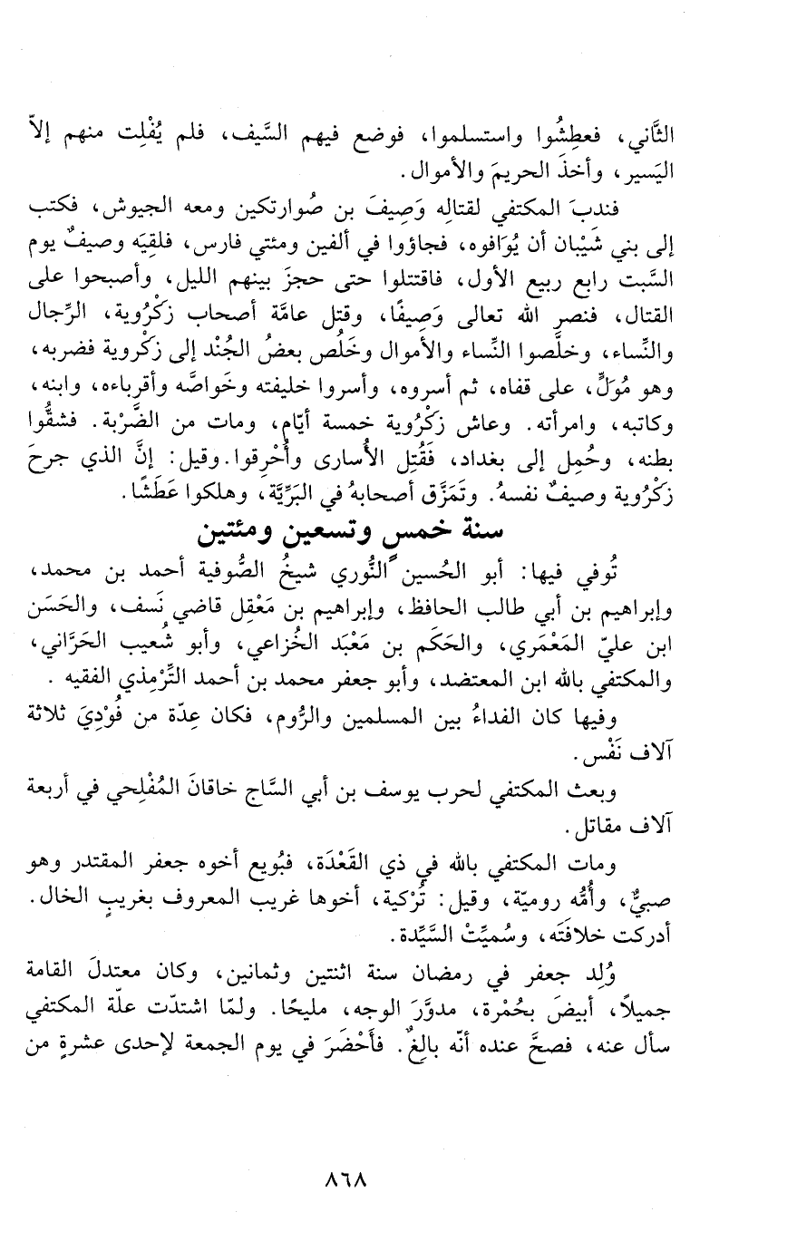 ومات المكتفي بالله في ذي القِعْدَة، فبُويع أخوه جعفر المقتدر وهو صبيّ، وأُمُّه روميّة، وقيل: تُرْكية، أخوها غريب المعروف بغريب الخال. أدركت خلافته، وَسُمِّيَتِ السّيّدة.