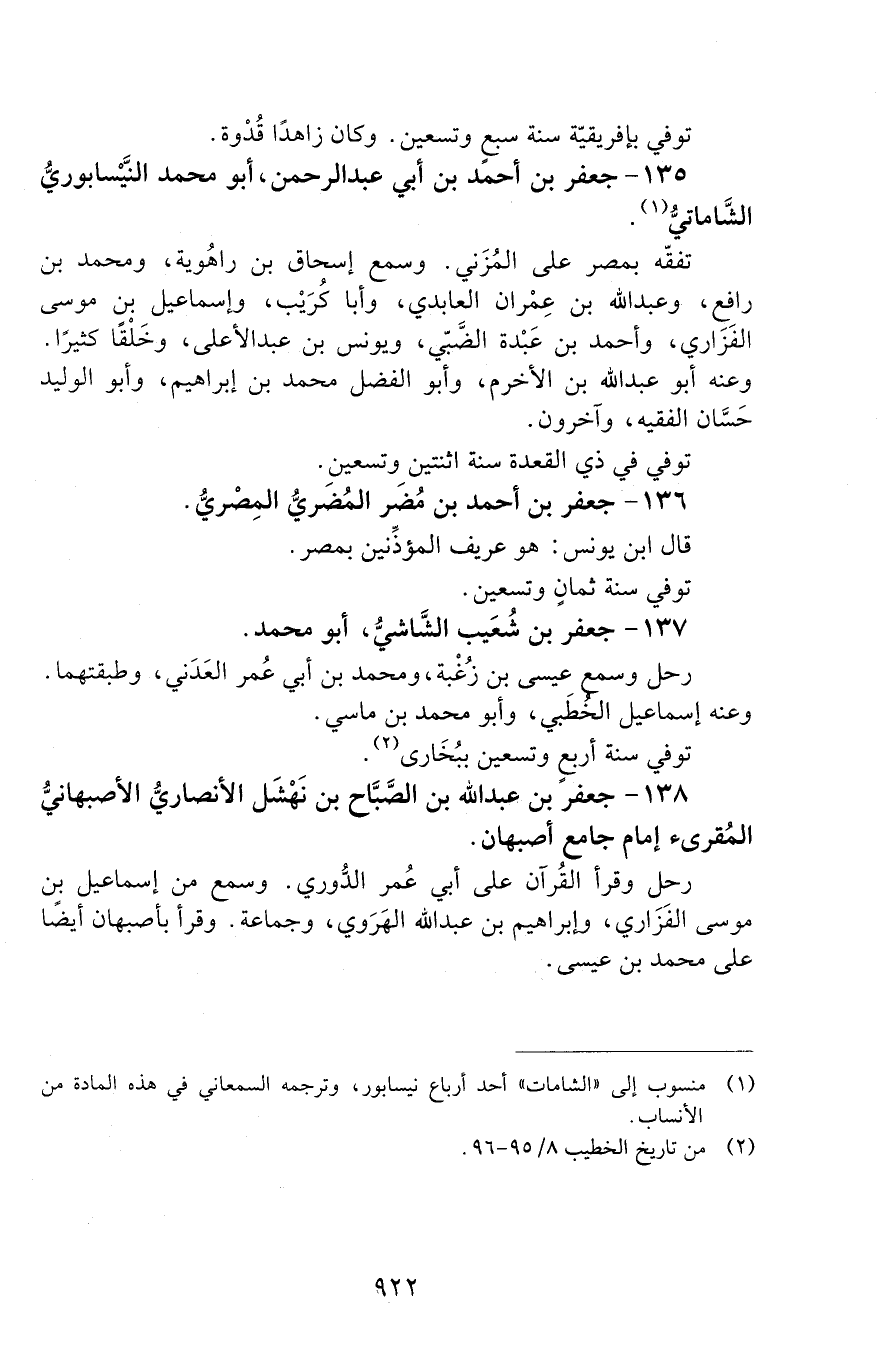 135 - جعفر بن أحمد بن أبي عبد الرحمن أبو محمد النَّيْسَابوريُّ الشاماتي. [الوفاة: 291 - 300 ه]