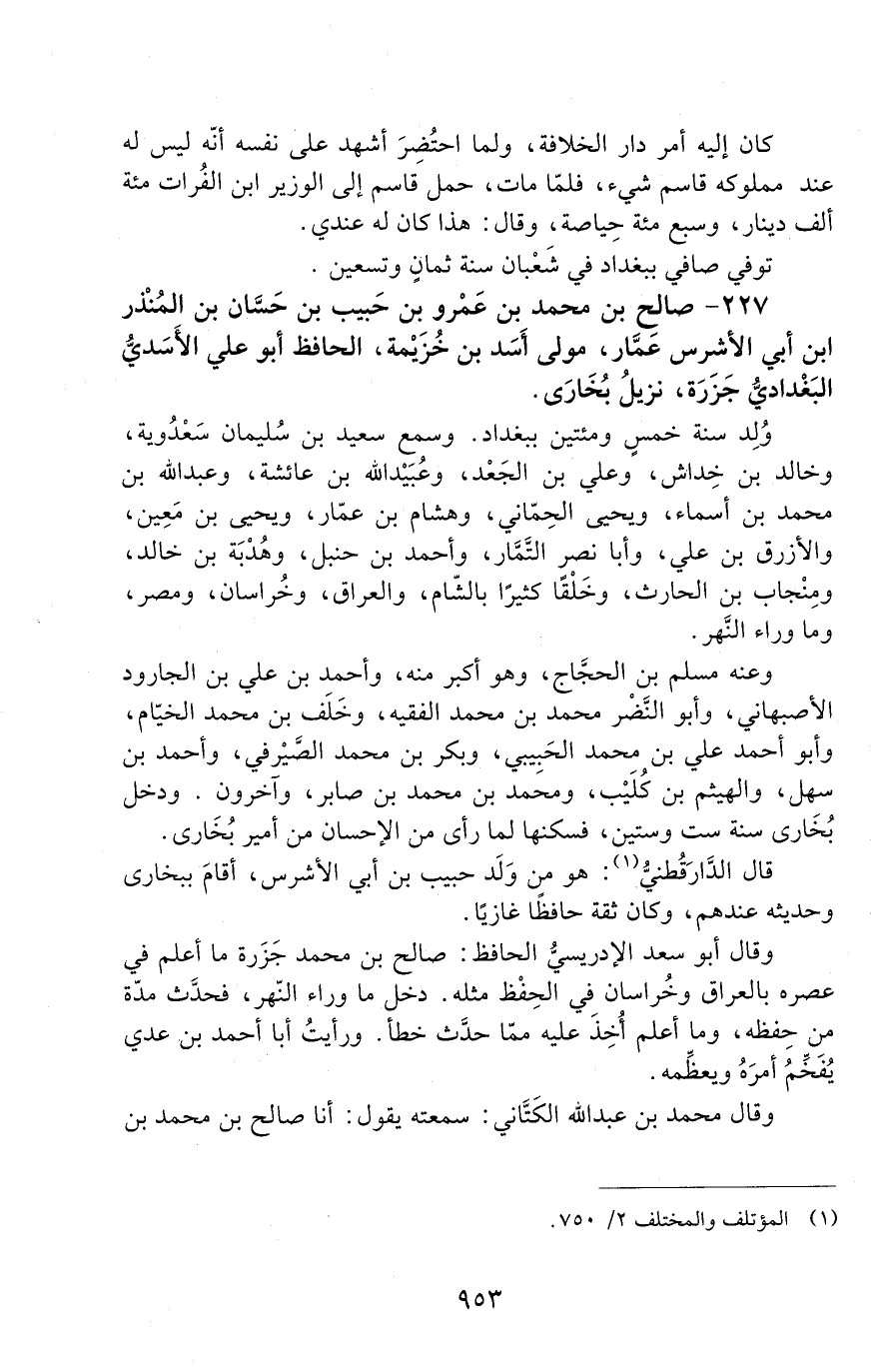 227 - صالح بن محمد بن عَمْرو بن حبيب بن حسان بن المنذر ابن أبي الأشرس عمّار، مولى أسَد بن خُزَيْمة، الحافظ أبو عليّ الأَسَديّ البَغْداديُّ جَزَرَة. [الوفاة: 291 - 300 ه]