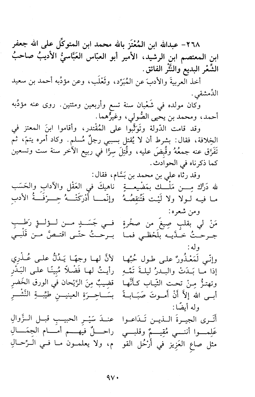 268 - عبد الله ابن المعتز بالله محمد ابن المتوكل على الله جعفر بن المعتصم ابن الرشيد، الأمير أبو العبّاس العبّاسيّ الأديب [الوفاة: 291 - 300 ه]