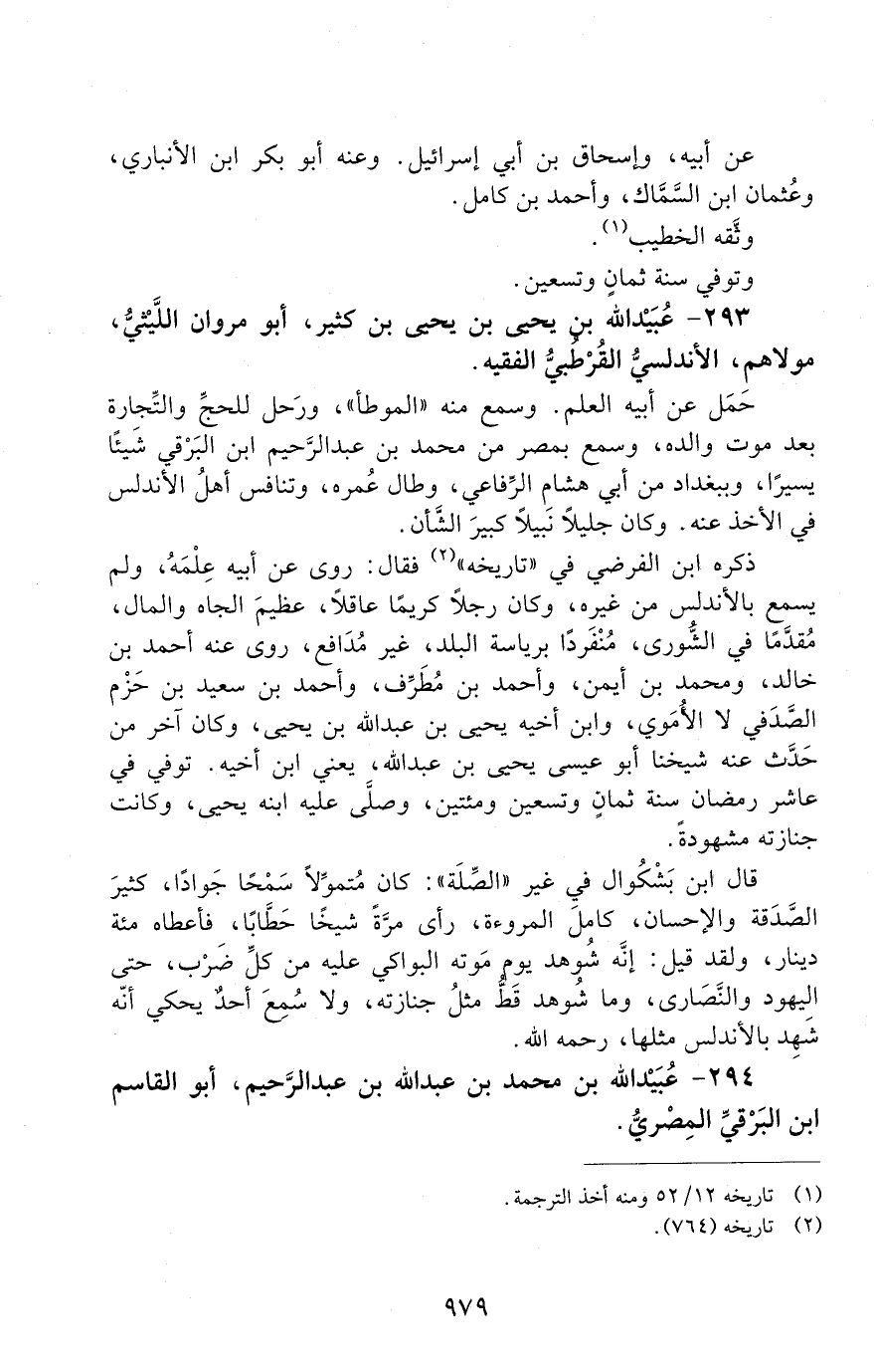 293 - عُبَيْد الله بن يحيى بن يحيى بن كثير. أبو مروان اللَّيْثيّ مولاهم الأندلسيّ القُرْطُبيّ الفقيه. [الوفاة: 291 - 300 ه]