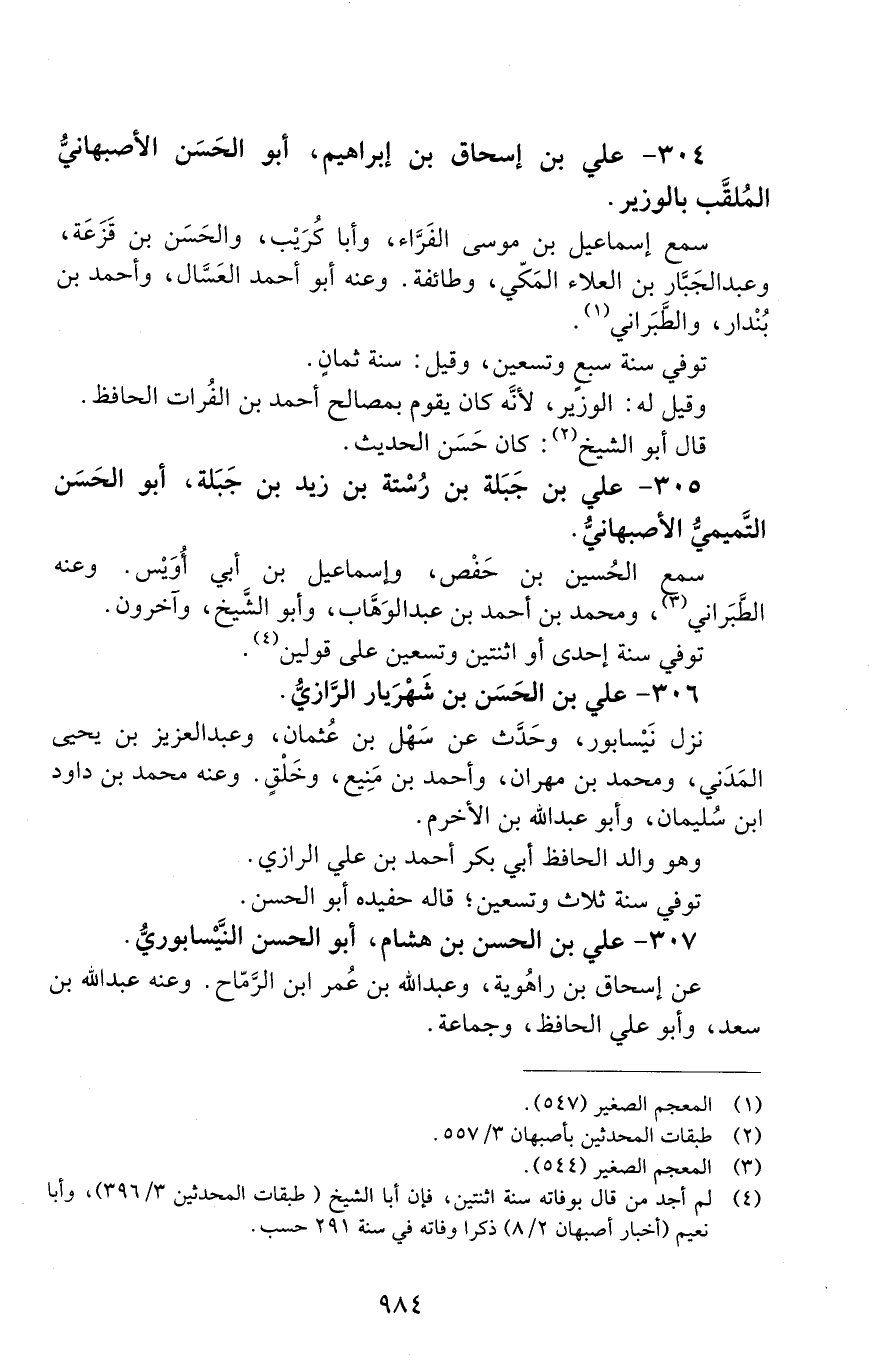 304 - عليّ بن إسحاق بن إبراهيم. أبو الحَسَن الأصبهانيّ الملقَّب بالوزير. [الوفاة: 291 - 300 ه]