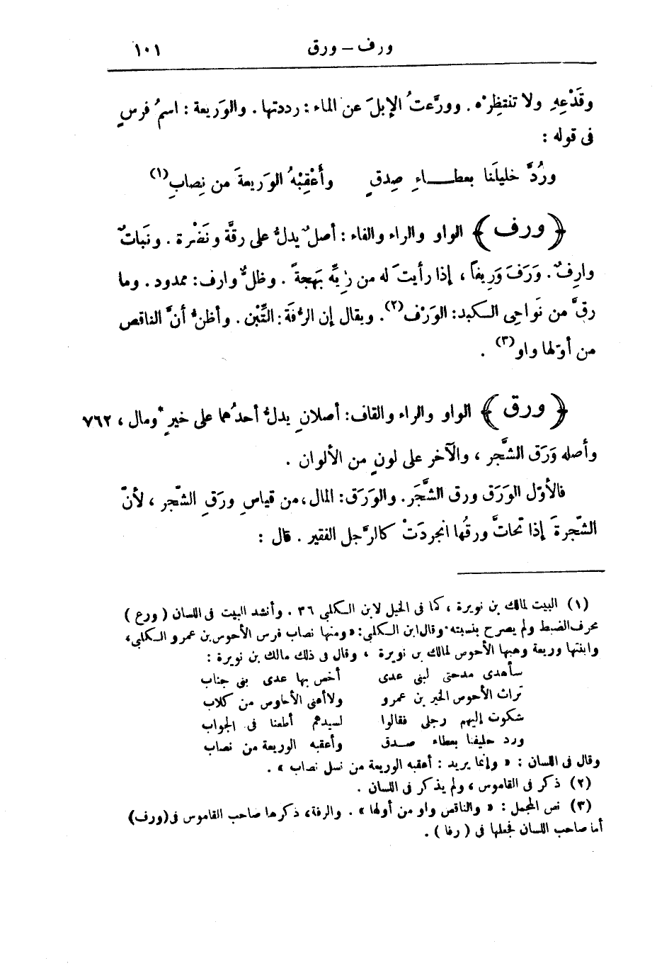 فَالْأَوَّلُ الْوَرَقُ وَرَقُ الشَّجَرِ. وَالْوَرَقُ: الْمَالُ، مِنْ قِيَاسِ وَرَقِ الشَّجَرِ، لِأَنَّ الشَّجَرَةَ إِذَا تَحَاتَّ وَرَقُهَا انْجَرَدَتْ كَالرَّجُلِ الْفَقِيرِ. قَالَ: