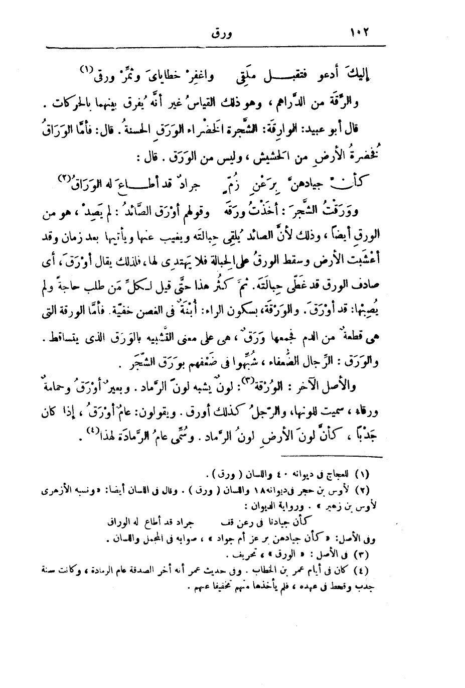 قَالَ أَبُو عُبَيْدٍ: الْوَارِقَةُ: الشَّجَرَةُ الْخَضْرَاءُ الْوَرَقِ الْحَسَنَةُ. قَالَ: فَأَمَّا الْوَرَاقُ فَخُضْرَةُ الْأَرْضِ مِنَ الْحَشِيشِ، وَلَيْسَ مِنَ الْوَرَقِ. قَالَ: