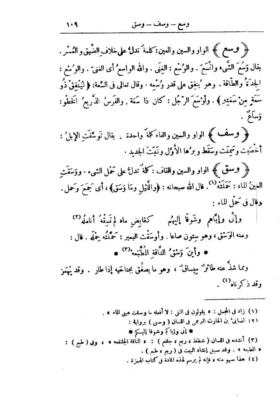 (وَسَعَ) الْوَاوُ وَالسِّينُ وَالْعَيْنُ: كَلِمَةٌ تَدُلُّ عَلَى خِلَافِ الضِّيقِ وَالْعُسْرِ. يُقَالُ وَسُعَ الشَّيْءُ وَاتَّسَعَ. وَالْوُسْعُ: الْغِنَى. وَاللَّهُ الْوَاسِعُ أَيِ الْغَنِيُّ. وَالْوُسْعُ: الْجِدَةُ وَالطَّاقَةُ. وَهُوَ يُنْفِقُ عَلَى قَدْرِ وُسْعِهِ. وَقَالَ تَعَالَى فِي السَّعَةِ: {لِيُنْفِقْ ذُو سَعَةٍ مِنْ سَعَتِهِ} [الطلاق: 7] . وَأَوْسَعَ الرَّجُلُ: كَانَ ذَا سَعَةٍ. وَالْفَرَسُ الذَّرِيعُ الْخَطْوِ: وَسَاعٌ.