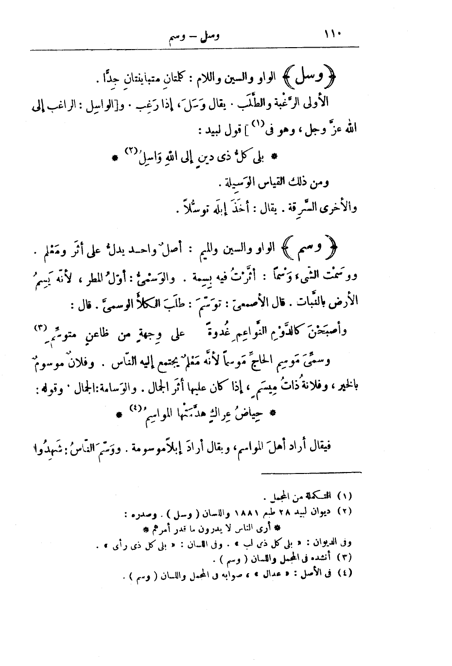 الْأُولَى الرَّغْبَةُ وَالطَّلَبُ. يُقَالُ وَسَلَ، إِذَا رَغِبَ. وَ [الْوَاسِلُ: الرَّاغِبُ إِلَى اللَّهِ عَزَّ وَجَلَّ، وَهُوَ فِي] قَوْلِ لَبِيَدٍ: