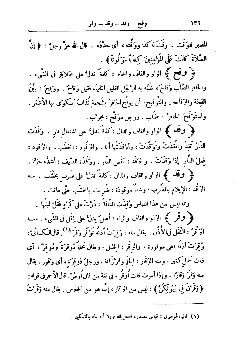 (وَقَرَ) الْوَاوُ وَالْقَافُ وَالرَّاءُ: أَصْلٌ يَدُلُّ عَلَى ثِقَلٍ فِي الشَّيْءِ. مِنْهُ الْوَقْرُ: الثِّقَلُ فِي الْأُذُنِ. يُقَالُ مِنْهُ: وَقِرَتْ أُذُنُهُ تَوْقَرُ وَقْرًا. قَالَ الْكِسَائِيُّ: وُقِرَتْ أُذُنُهُ فَهِيَ مَوْقُورَةٌ. وَالْوِقْرُ: الْحِمْلُ. وَيُقَالُ نَخْلَةٌ مُوَقَّرَةٌ وَمُوقِرٌ، أَيْ ذَاتُ حَمْلٍ كَثِيرٍ. وَمِنْهُ الْوَقَارُ: الْحِلْمُ وَالرَّزَانَةُ. وَرَجُلٌ ذُو قِرَةٍ، أَيْ وَقُورٌ. يُقَالُ مِنْهُ وَقَرَ وَقَارًا. وَإِذَا أَمَرْتَ قُلْتَ اوقُرْ، فِي لُغَةِ مَنْ قَالَ اومُرْ. قَالَ الْأَحْمَرُ فِي قَوْلِهِ: {وَقَرْنَ فِي بُيُوتِكُنَّ} [الأحزاب: 33] : لَيْسَ مِنَ الْوَقَارِ، إِنَّمَا هُوَ مِنَ الْجُلُوسِ. يُقَالُ مِنْهُ وَقَرْتُ