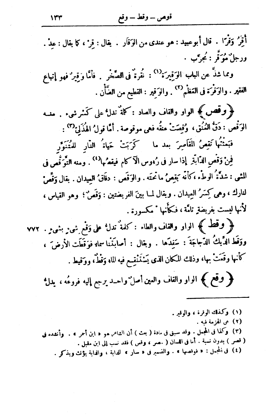 وَمِمَّا شَذَّ عَنِ الْبَابِ الْوَقِيرَةُ: نُقْرَةٌ فِي الصَّخْرِ. فَأَمَّا وَقِيرٌ فَهُوَ إِتْبَاعُ الْفَقِيرِ. وَالْوَقْرَةُ فِي الْعَظْمِ. وَالْوَقِيرُ: الْقَطِيعُ مِنَ الضَّأْنِ.