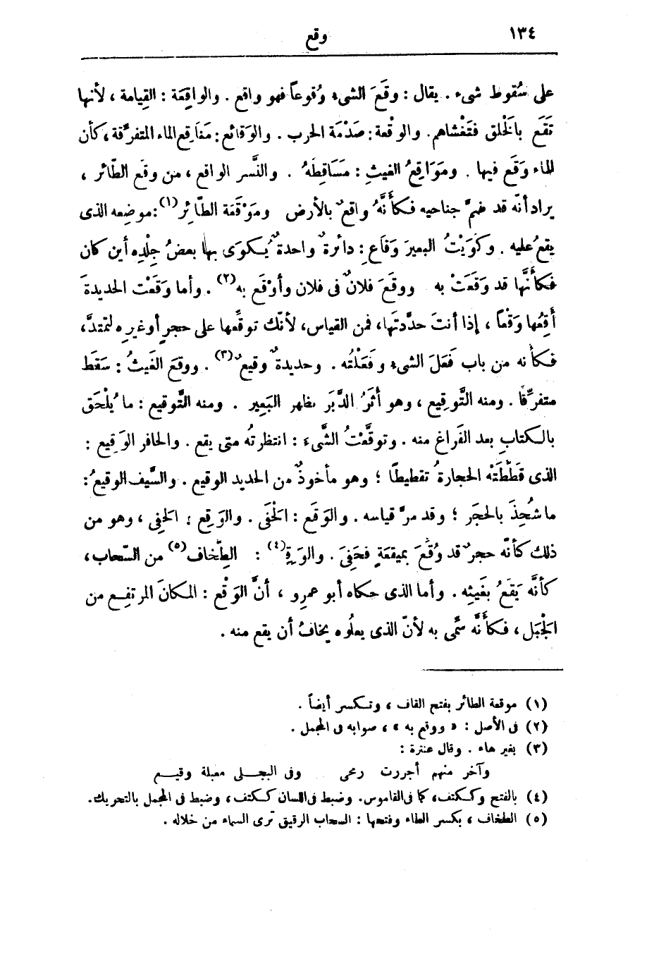 عَلَى سُقُوطِ شَيْءٍ. يُقَالُ: وَقَعَ الشَّيْءُ وُقُوعًا فَهُوَ وَاقِعٌ. وَالْوَاقِعَةُ: الْقِيَامَةُ، لِأَنَّهَا تَقَعُ بِالْخَلْقِ فَتَغْشَاهُمْ. وَالْوَقْعَةُ: صَدْمَةُ الْحَرْبِ. وَالْوَقَائِعُ: مَنَاقِعُ الْمَاءِ الْمُتَفَرِّقَةُ، كَأَنَّ الْمَاءَ وَقَعَ فِيهَا. وَمَوَاقِعُ الْغَيْثِ: مَسَاقِطُهُ. وَالنَّسْرُ الْوَاقِعُ، مِنْ وَقْعِ الطَّائِرِ، يُرَادُ أَنَّهُ قَدْ ضَمَّ جَنَاحَيْهِ فَكَأَنَّهُ وَاقِعٌ بِالْأَرْضِ. وَمَوْقَعَةُ الطَّائِرِ: مَوْضِعُهُ الَّذِي يَقَعُ عَلَيْهِ. وَكَوَيْتُ الْبَعِيرَ وَقَاعِ: دَائِرَةٌ وَاحِدَةٌ يُكْوَى بِهَا بَعْضُ جِلْدِهِ أَيْنَ كَانَ فَكَأَنَّهَا قَدْ وَقَعَتْ بِهِ. وَوَقَعَ فُلَانٌ فِي فُلَانٍ وَأَوْقَعَ بِهِ. وَأَمَّا وَقَعْتُ الْحَدِيدَةَ أَقِعُهَا وَقْعًا، إِذَا أَنْتَ حَدَّدْتَهَا، فَمِنَ الْقِيَاسِ، لِأَنَّكَ تُوَقِّعُهَا عَلَى حَجَرٍ أَوْ غَيْرِهِ لِتَمْتَدَّ، فَكَأَنَّهُ مِنْ بَابِ فَعَلَ الشَّيْءُ وَفَعَلْتُهُ. وَحَدِيدَةٌ وَقِيعٌ. وَوَقَعَ الْغَيْثُ: سَقَطَ مُتَفَرِّقًا. وَمِنْهُ التَّوْقِيعُ، وَهُوَ أَثَرُ الدَّبَرِ بِظَهْرِ الْبَعِيرِ. وَمِنْهُ التَّوْقِيعُ: مَا يُلْحَقُ بِالْكِتَابِ بَعْدَ الْفَرَاغِ مِنْهُ. وَتَوَقَّعْتُ الشَّيْءَ: انْتَظَرْتُهُ مَتَى يَقَعُ. وَالْحَافِرُ الْوَقِيعُ: الَّذِي قَطَّطَتْهُ الْحِجَارَةُ تَقْطِيطًا ; وَهُوَ مَأْخُوذٌ مِنَ الْحَدِيدِ الْوَقِيعِ. وَالسَّيْفُ الْوَقِيعُ: مَا شُحِذَ بِالْحَجَرِ ; وَقَدْ مَرَّ قِيَاسُهُ. وَالْوَقَعُ: الْحَفَى. وَالْوَقِعُ: الْحَفِيُّ، وَهُوَ مِنْ ذَلِكَ كَأَنَّهُ حَجَرٌ قَدْ وَقَعَ بِمِيقَعَةٍ فَحَفِيَ. وَالْوَقِعُ: الطِّخَافُ مِنَ السَّحَابِ، كَأَنَّهُ يَقَعُ بِغَيْثِهِ. وَأَمَّا الَّذِي حَكَاهُ أَبُو عَمْرٍو، أَنَّ الْوَقْعَ: الْمَكَانَ الْمُرْتَفِعَ مِنَ الْجَبَلِ، فَكَأَنَّهُ سُمِّي بِهِ لِأَنَّ الَّذِي يَعْلُوهُ يَخَافُ أَنْ يَقَعَ مِنْهُ.