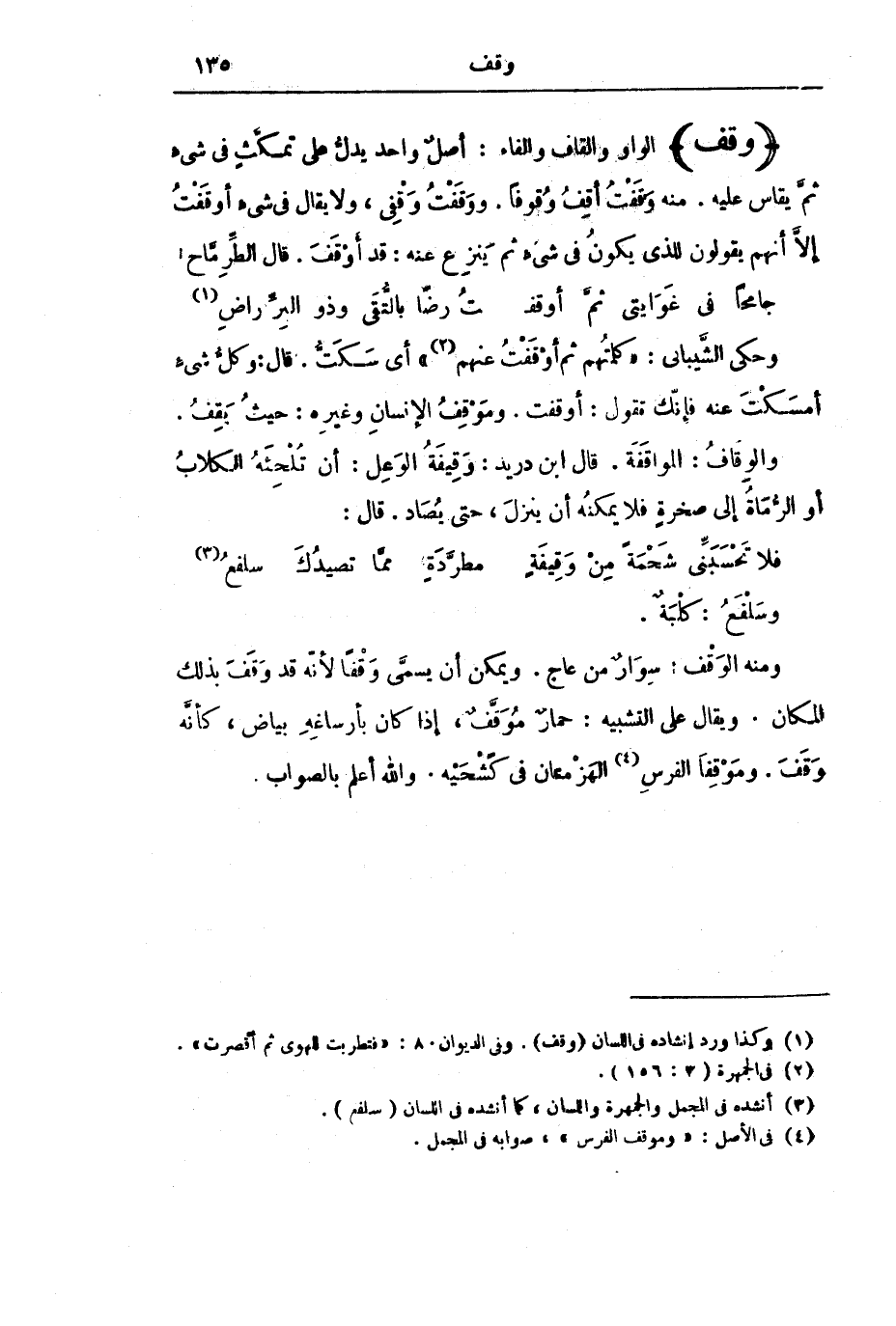 (وَقَفَ) الْوَاوُ وَالْقَافُ وَالْفَاءُ: أَصْلٌ وَاحِدٌ يَدُلُّ عَلَى تَمَكُّثٍ فِي شَيْءٍ ثُمَّ يُقَاسُ عَلَيْهِ. مِنْهُ وَقَفْتُ أَقِفُ وُقُوفًا. وَوَقَفْتُ وَقْفِي، وَلَا يُقَالُ فِي شَيْءٍ أَوْقَفْتُ إِلَّا أَنَّهُمْ يَقُولُونَ لِلَّذِي يَكُونُ فِي شَيْءٍ ثُمَّ يَنْزِعُ عَنْهُ: قَدْ أَوْقَفَ. قَالَ الطِّرِمَّاحُ: