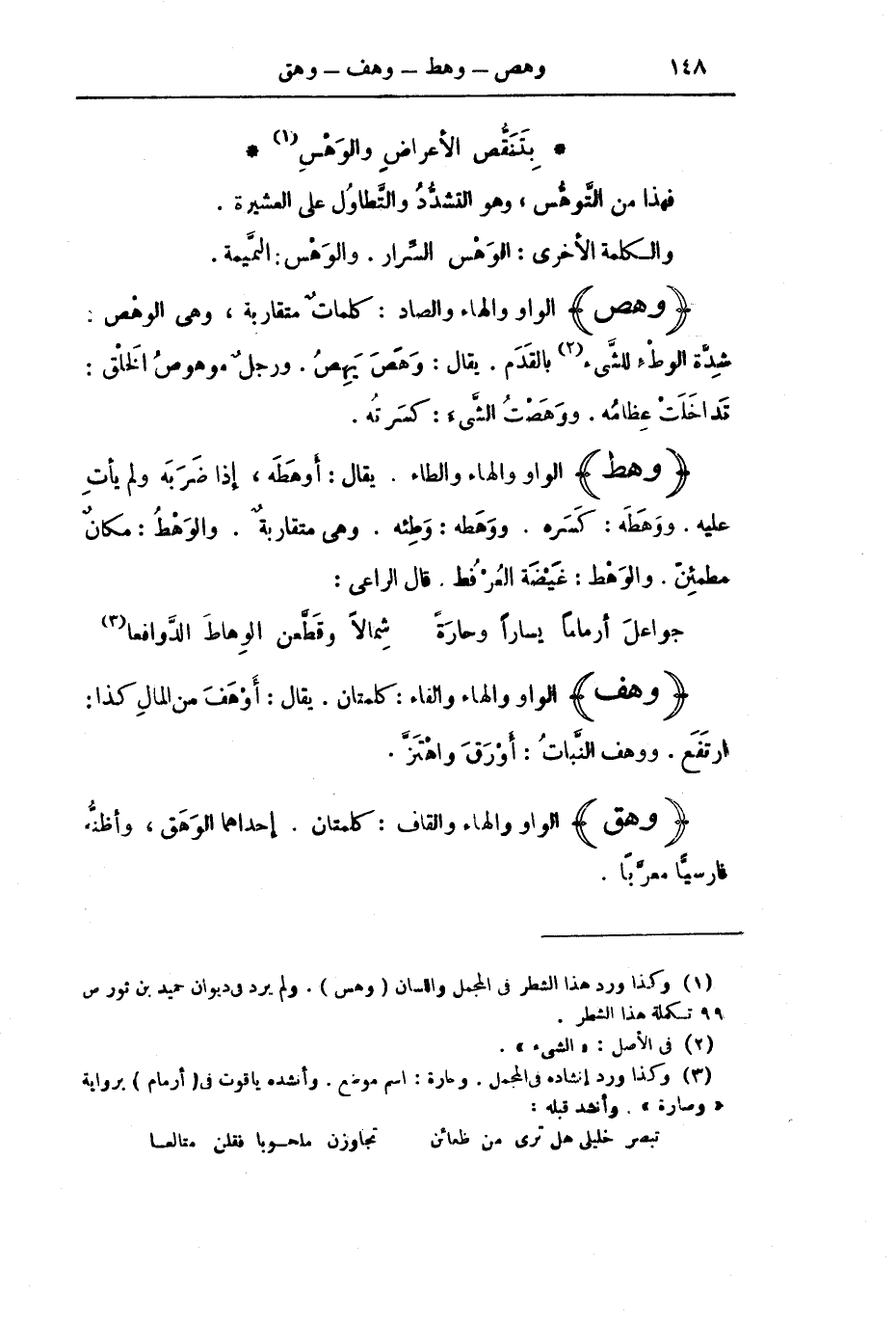 (وَهَطَ) الْوَاوُ وَالْهَاءُ وَالطَّاءُ. يُقَالُ: أَوْهَطَهُ، إِذَا ضَرَبَهُ وَلَمْ يَأْتِ عَلَيْهِ. وَوَهَطَهُ: كَسَرَهُ. وَوَهَطَهُ: وَطِئَهُ. وَهِيَ مُتَقَارِبَةٌ. وَالْوَهْطُ: مَكَانٌ مُطْمَئِنٌّ. وَالْوَهْطُ: غَيْضَةُ الْعُرْفُطِ. قَالَ الرَّاعِي: