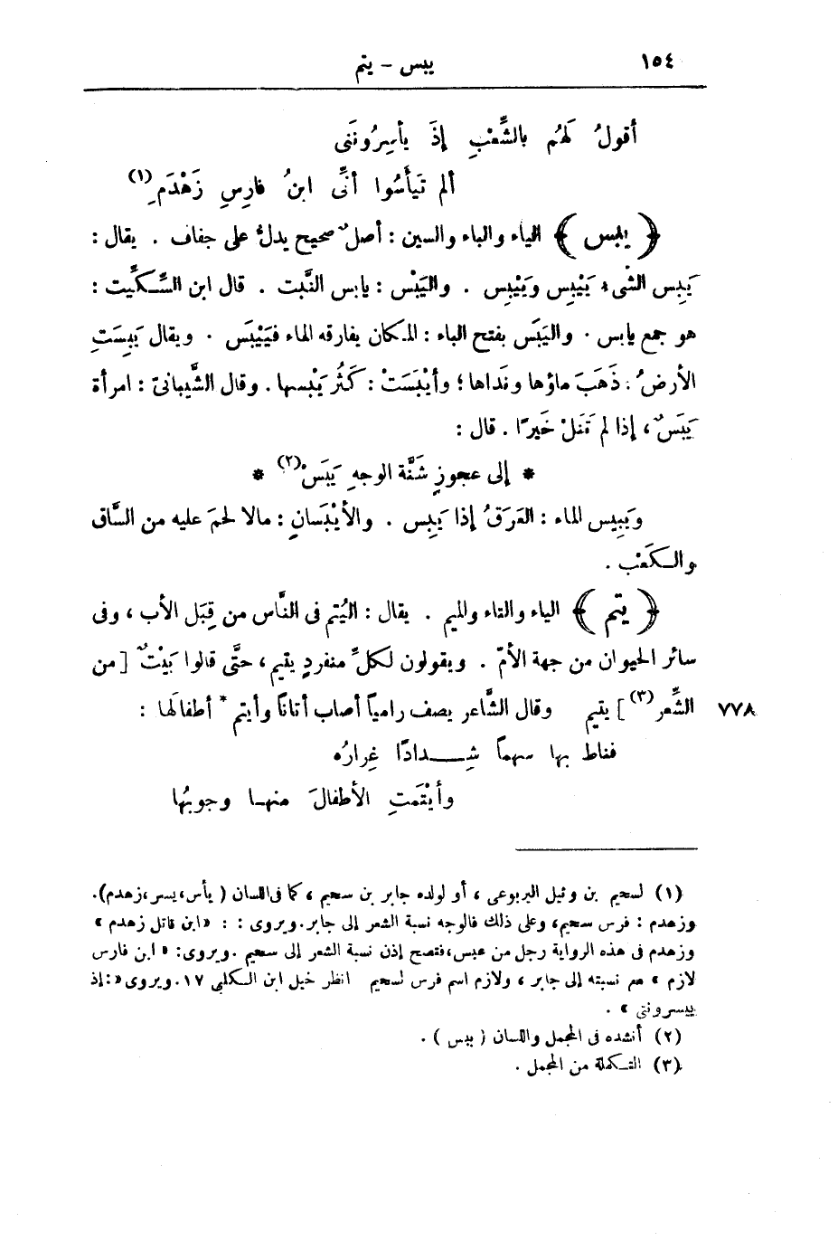 (يَتَمَ) الْيَاءُ وَالتَّاءُ وَالْمِيمُ. يُقَالُ: الْيُتْمُ فِي النَّاسِ مِنْ قِبَلِ الْأَبِ، وَفِي سَائِرِ الْحَيَوَانِ مِنْ جِهَةِ الْأُمِّ. وَيَقُولُونَ لِكُلِّ مُنْفَرِدٍ يَتِيمٌ، حَتَّى قَالُوا بَيْتٌ [مِنَ الشِّعْرِ] يَتِيمٌ. وَقَالَ الشَّاعِرُ يَصِفُ رَامِيًا أَصَابَ أَتَانًا وَأَيْتَمَ أَطْفَالَهَا: