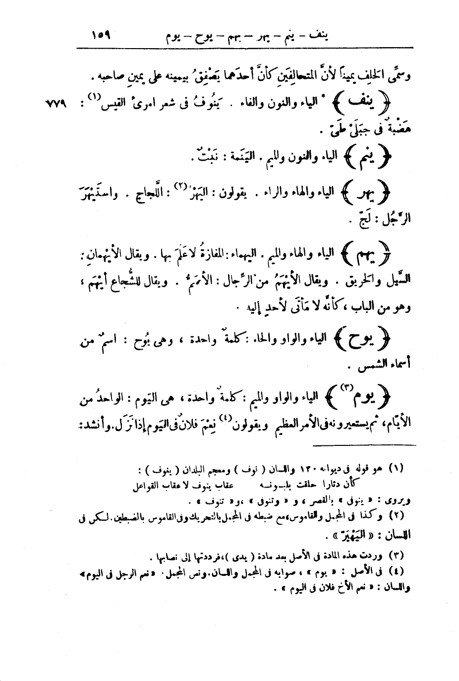 (يَوَمَ) الْيَاءُ وَالْوَاوُ وَالْمِيمُ: كَلِمَةٌ وَاحِدَةٌ، هِيَ الْيَوْمُ: الْوَاحِدُ مِنَ الْأَيَّامِ، ثُمَّ يَسْتَعِيرُونَهُ فِي الْأَمْرِ الْعَظِيمِ وَيَقُولُونَ نِعْمَ فُلَانٌ فِي الْيَوْمِ إِذَا نَزَلَ. وَأَنْشَدَ: