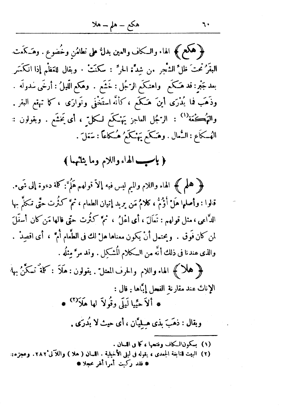 (هَلَمَ) الْهَاءُ وَاللَّامُ وَالْمِيمُ لَيْسَ فِيهِ إِلَّا قَوْلُهُمْ هَلُمَّ: كَلِمَةُ دَعْوَةٍ إِلَى شَيْءٍ. قَالُوا: وَأَصْلُهَا هَلْ أَؤُمُّ، كَلَامُ مَنْ يُرِيدُ إِتْيَانَ الطَّعَامِ، ثُمَّ كَثُرَتْ حَتَّى تَكَلَّمَ بِهَا الدَّاعِي، مِثْلَ قَوْلِهِمْ: تَعَالَ، أَيِ اعْلُ، ثُمَّ كَثُرَتْ حَتَّى قَالَهَا مَنْ كَانَ أَسْفَلَ لِمَنْ كَانَ فَوْقَ. وَيَحْتَمِلُ أَنْ يَكُونَ مَعْنَاهَا هَلْ لَكَ فِي الطَّعَامِ أُمَّ، أَيِ اقْصِدْ. وَالَّذِي عِنْدَنَا فِي ذَلِكَ أَنَّهُ مِنَ الْكَلَامِ الْمُشْكِلِ. وَقَدْ مَرَّ مِثْلُهُ.