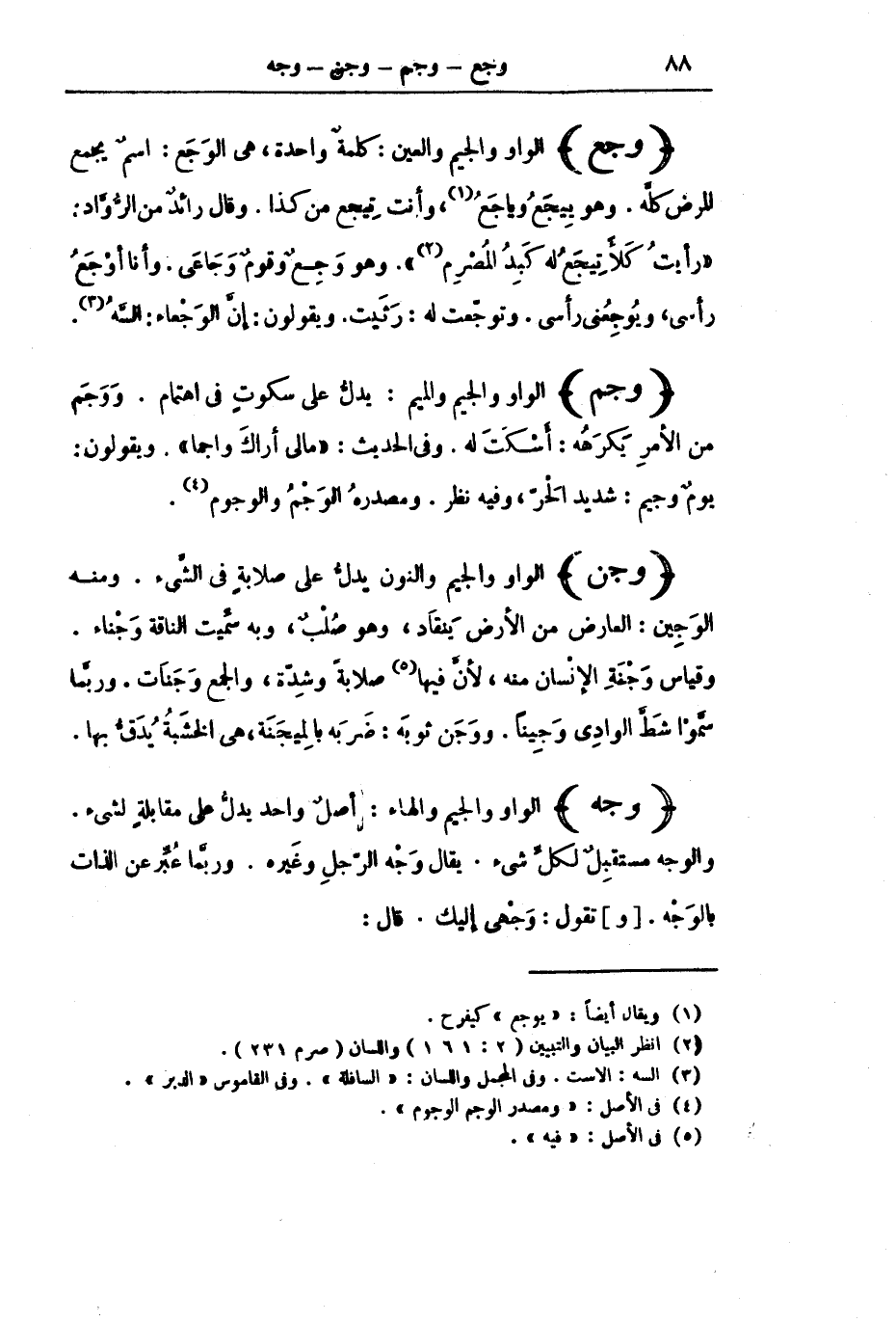 (وَجَهَ) الْوَاوُ وَالْجِيمُ وَالْهَاءُ: أَصْلٌ وَاحِدٌ يَدُلُّ عَلَى مُقَابَلَةٍ لِشَيْءٍ. وَالْوَجْهُ مُسْتَقْبِلٌ لِكُلِّ شَيْءٍ. يُقَالُ وَجْهُ الرَّجُلِ وَغَيْرُهُ. وَرُبَّمَا عُبِّرَ عَنِ الذَّاتِ بِالْوَجْهِ. [وَ] تَقُولُ: وَجْهِي إِلَيْكَ. قَالَ: