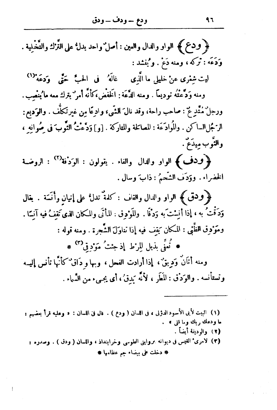 وَمِنْهُ وَدَّعْتُهُ تَوْدِيعًا. وَمِنْهُ الدَّعَةُ: الْخَفْضُ، كَأَنَّهُ أَمْرٌ يَتْرُكُ مَعَهُ مَا يُنْصِبُ. وَرَجُلٌ مُتَّدِعٌ: صَاحِبُ رَاحَةٍ، وَقَدْ نَالَ الشَّيْءَ وَادِعًا مِنْ غَيْرِ تَكَلُّفٍ. وَالْوَدِيعُ: الرَّجُلُ السَّاكِنُ. وَالْمُوَادَعَةُ: الْمُصَالَحَةُ وَالْمُتَارَكَةُ. [وَ] وَدَّعْتُ الثَّوْبَ فِي صُوَانِهِ، وَالثَّوْبَ مِيدَعٌ.