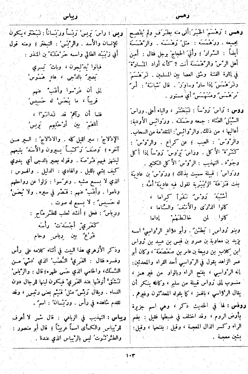 روس: رَاسَ رَوْساً: تَبَخْتَر، وَالْيَاءُ أَعلى. وراسَ السَّيْلُ الغُثاءَ: جَمَعَهُ وحَمَلَه. ورَوائِس الأَودية: أَعاليها، مِنْ ذَلِكَ. والرَّوائِسُ: المتقدِّمة مِنَ السَّحَابِ. والرَّوْسُ: الْعَيْبُ؛ عَنْ كُرَاعٍ. والرَّوْسُ: كَثْرَةُ الأَكل. وراسَ يَرُوسُ رَوْساً إِذا أَكل وجَوَّد. التَّهْذِيبُ: الرَّوْسُ الأَكل الْكَثِيرُ. ورَواسُ: قَبِيلَةٌ سُمِّيَتْ بِذَلِكَ؛ ورَوْسُ بْنُ عادِيَة بِنْتِ قَزَعَةَ الزُّبَيْرية تَقُولُ فِيهِ عادِيَةُ أُمُّه: