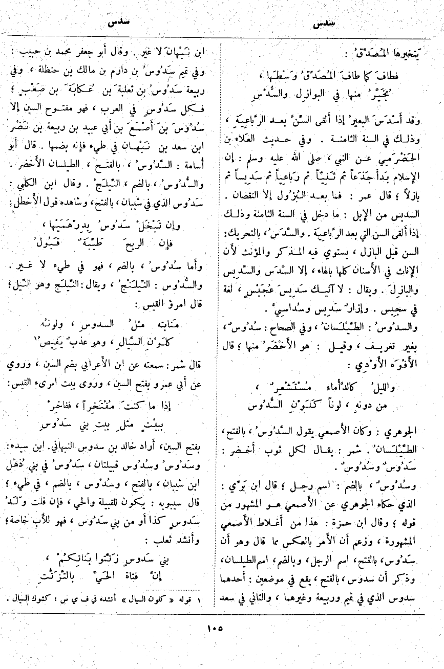 ؛ قال عُمَرُ: فَمَا بَعْدَ البُزُول إِلا النُّقْصَانَ. السَّدِيسُ مِنَ الإِبل: مَا دَخَلَ فِي السَّنَةِ الثَّامِنَةِ وَذَلِكَ إِذا أَلقى السِّنَّ الَّتِي بَعْدَ الرَّباعِيَة. والسَّدَسُ، بِالتَّحْرِيكِ: السِّنُّ قَبْلَ الْبَازِلِ، يَسْتَوِي فِيهِ الْمُذَكَّرُ وَالْمُؤَنَّثُ لأَن الإِناث فِي الأَسنان كُلُّهَا بِالْهَاءِ، إِلا السَّدَس والسَّدِيس والبازِلَ. وَيُقَالُ: لَا آتِيكَ سَدِيسَ عُجَيْسٍ، لُغَةٌ فِي سجِيس. وإِزارٌ سَدِيس وسُداسِيٌّ. والسدُوسُ: الطَّيْلَسانُ، وَفِي الصِّحَاحِ: سُدُوسٌ، بِغَيْرِ تَعْرِيفٍ، وَقِيلَ: هُوَ الأَخْضَرُ مِنْهَا؛ قَالَ الأَفْوَه الأَوْدِي: