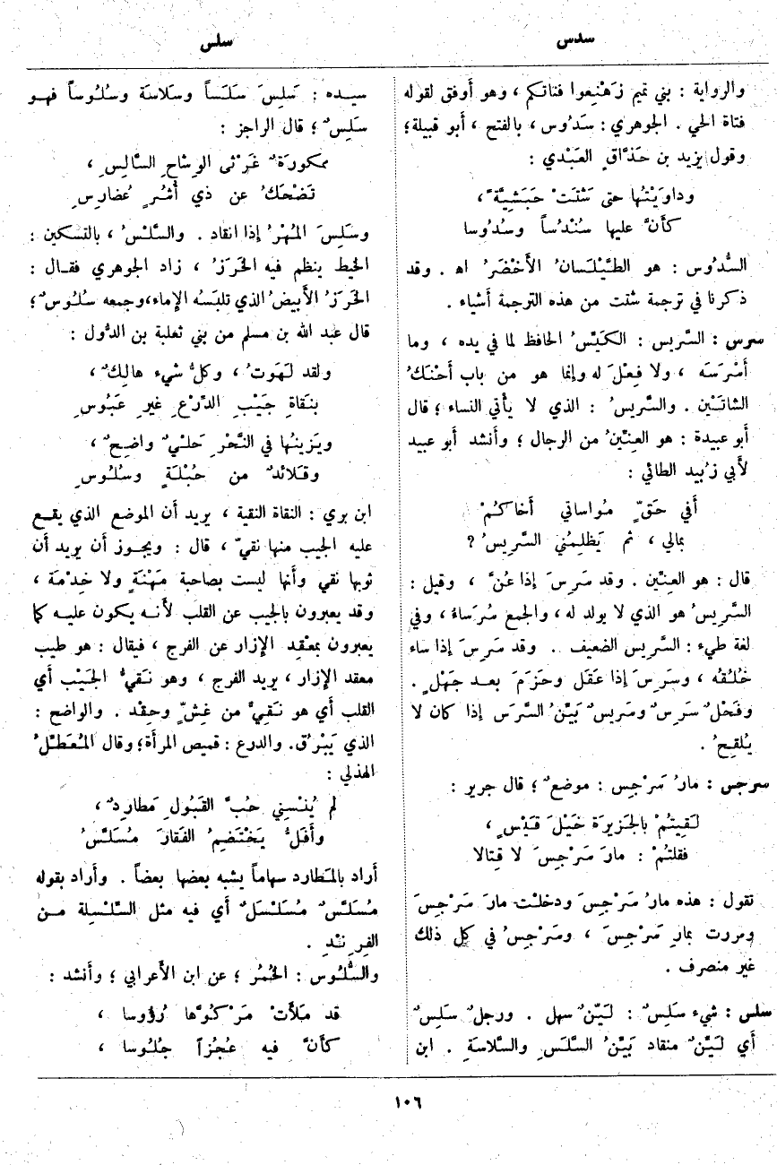سلس: شَيْءٌ سَلِسٌ: لَيّنٌ سَهْلٌ. ورجلٌ سَلِسٌ أَي لَيِّنٌ مُنْقَادٌ بَيِّنُ السَّلَسِ والسَّلاسَةِ. ابْنُ سِيدَهْ: سَلِسَ سَلَساً وسَلاسَة وسُلُوساً فَهُوَ سَلِسٌ؛ قَالَ الرَّاجِزُ: