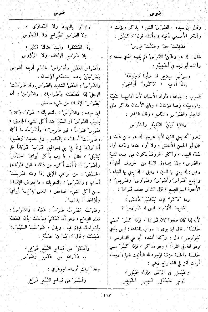 وَقَالَ ابْنُ سِيدَهْ: الضِّرْسُ السِّنُّ، يُذَكَّرُ ويؤَنث، وأَنكر الأَصمعي تأْنيثه؛ وأَنشد قولَ دُكَيْنٍ: