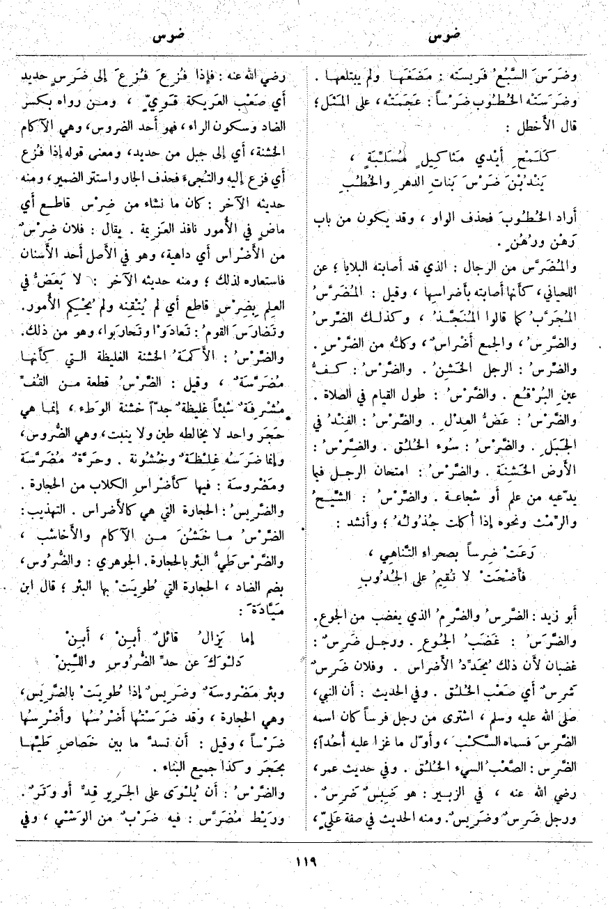 أَي لَمْ يُتْقِنه وَلَمْ يُحْكِم الأُمور. وتَضارَسَ القومُ: تَعادَوْا وتَحارَبوا، وَهُوَ مِنْ ذَلِكَ. والضِّرْسُ: الأَكمَةُ الْخَشِنَةُ الْغَلِيظَةُ الَّتِي كأَنها مُضَرَّسَةٌ، وَقِيلَ: الضِّرْسُ قِطْعَةٌ مِنَ القُفِّ مُشْرِفَةٌ شَيْئًا غليظةٌ جِدًّا خَشِنَةُ الوَطء، إِنما هِيَ حَجَر وَاحِدٌ لَا يُخَالِطُهُ طِينٌ وَلَا يَنْبُتُ، وَهِيَ الضُّروس، وإِنما ضَرَسُه غِلْظَةٌ وخُشُونة. وحَرَّةٌ مُضَرَّسَة ومَضْروسَة: فيها كأَضْراسِ الْكِلَابِ مِنَ الْحِجَارَةِ. والضَّرِيسُ: الْحِجَارَةُ الَّتِي هِيَ كالأَضراس. التَّهْذِيبُ: الضِّرْسُ مَا خَشُنَ مِنَ الْآكَامِ والأَخاشب، والضَّرْس طَيُّ الْبِئْرِ بِالْحِجَارَةِ. الْجَوْهَرِيُّ: والضُّرُوس، بِضَمِّ الضَّادِ، الْحِجَارَةُ الَّتِي طُوِيَتْ بِهَا الْبِئْرُ؛ قَالَ ابْنُ مَيَّادَةَ:
