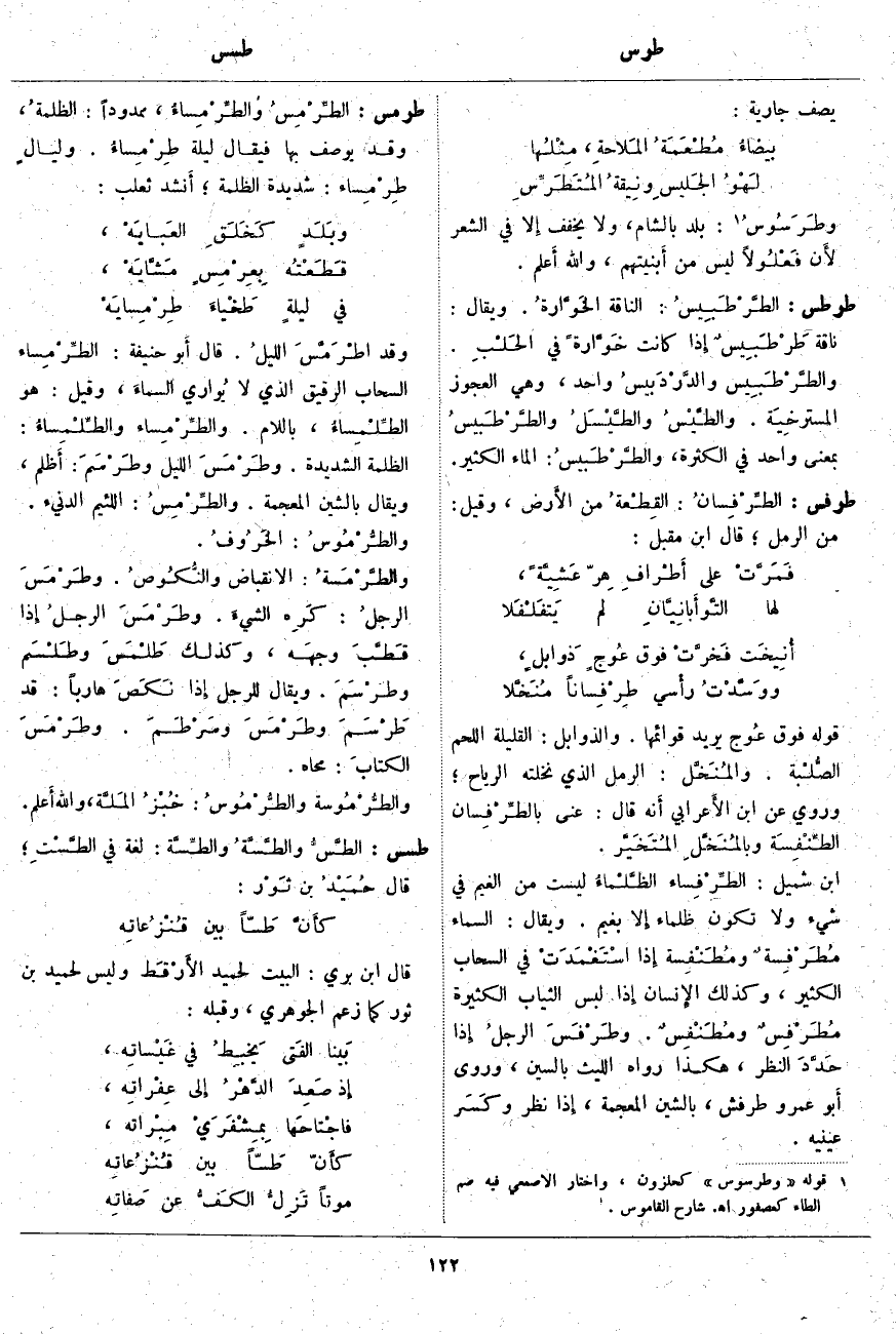 طرطس: الطَّرْطَبِيسُ: النَّاقَةُ الخَوَّارةُ. وَيُقَالُ: نَاقَةٌ طَرْطَبِيسٌ إِذا كَانَتْ خَوَّارةً فِي الحَلْبِ. والطَّرْطَبِيس والدَّرْدَبيسُ وَاحِدٌ، وَهِيَ الْعَجُوزُ المسترخِيَة. والطَّيْسُ والطَّيْسَلُ والطَّرْطَبيسُ بِمَعْنًى وَاحِدٍ فِي الْكَثْرَةِ، والطَّرْطَبيسُ: الْمَاءُ الْكَثِيرُ.