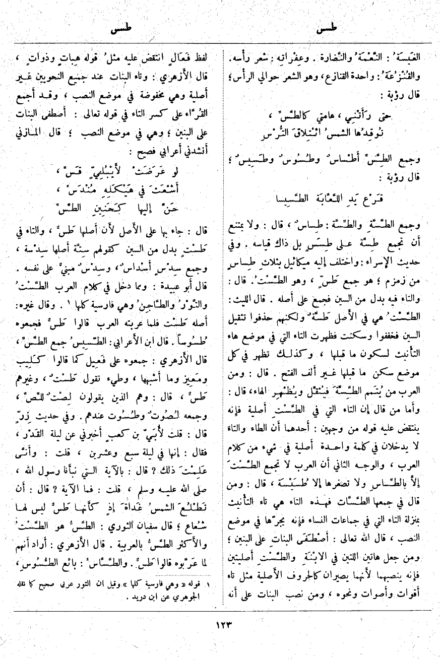 قَالَ: جَاءَ بِهَا عَلَى الأَصل لأَن أَصلها طَسٌ، وَالتَّاءُ فِي طَسْتٍ بَدَلٌ مِنَ السِّينِ كَقَوْلِهِمْ سِتَّة أَصلها سِدْسة، وَجَمْعُ سِدْسٍ أَسْداسُ، وسِدْسٌ مبنيٌ عَلَى نَفْسِهِ. قَالَ أَبو عُبَيْدَةَ: وَمِمَّا دَخَلَ فِي كَلَامِ الْعَرَبِ الطَّسْتُ والتَّوْرُ والطَّاجِنُ وَهِيَ فَارِسِيَّةٌ كُلُّهَا «2». وَقَالَ غَيْرُهُ: أَصله طَسْت فَلَمَّا عَرَّبَتْهُ الْعَرَبُ قَالُوا طَسٌّ فَجَمَعُوهُ طُسُوساً. قَالَ ابْنُ الأَعرابي: الطَّسِيسُ جَمْعُ الطَّسِّ، قَالَ الأَزهري: جَمَعُوهُ عَلَى فَعِيل كَمَا قَالُوا كَلِيب ومَعِيز وما أَشبهها، وطيء تَقُولُ طَسْتٌ، وَغَيْرُهُمْ طَسٌّ، قَالَ: وَهُمُ الَّذِينَ يَقُولُونَ لِصْتٌ للِّصِّ، وَجَمْعُهُ لُصُوتٌ وطُسُوت عِنْدَهُمْ. وَفِي حَدِيثِ