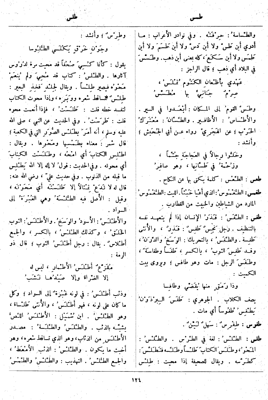 طلس: الطَّلْسُ: لُغَةٌ فِي الطِّرْس. والطَّلْسُ: المَحْوُ، وطَلَسَ الْكِتَابَ طَلْساً وطَلَّسه فتَطَلَّسَ: كطَرَّسه. وَيُقَالُ لِلصَّحِيفَةِ إِذا مُحِيَتْ: طِلْس وطِرْسٌ؛ وأَنشد:
